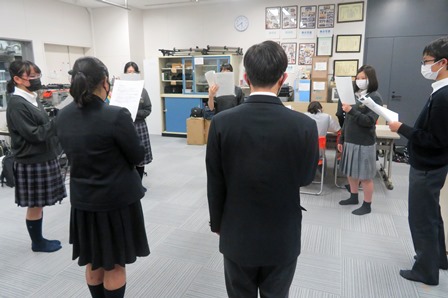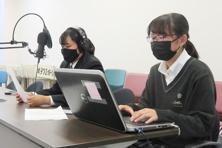 コロナ禍ということもあり、間隔を取って発声練習をしています。この日は放送室の隣にある生徒会室も借りて、発声練習や録音を実施しました。