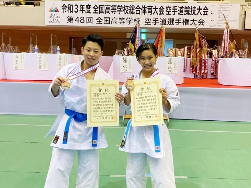 8月12日(木)から15日(日)の3日間、富山県の丸山総合公園体育館において、全国高等学校総合体育大会(インターハイ)が行われ、女子個人形で北口歌桜、男子個人形で秋吉優斗が優勝しました。この調子で全国選抜大会でも優勝を狙います。