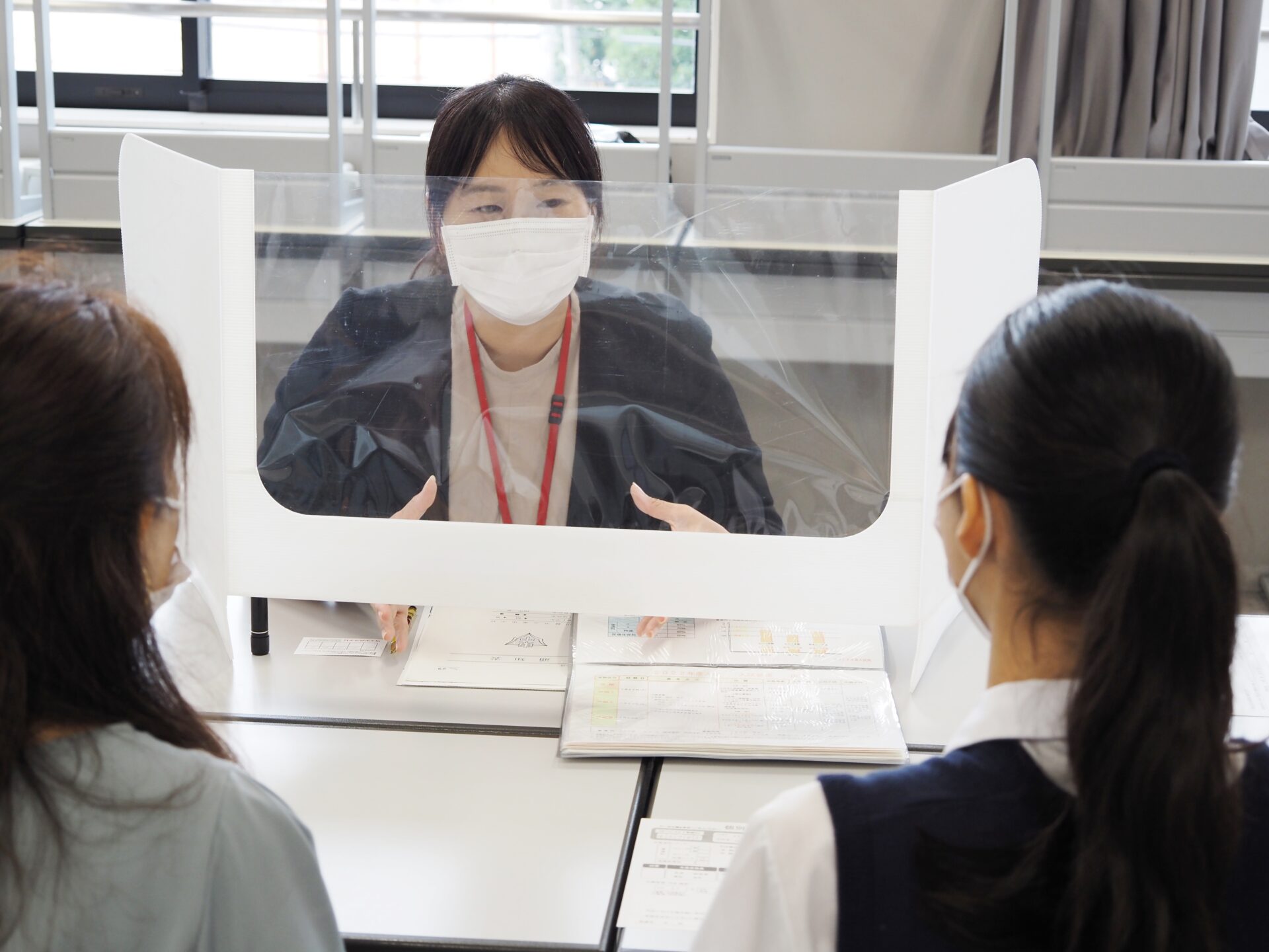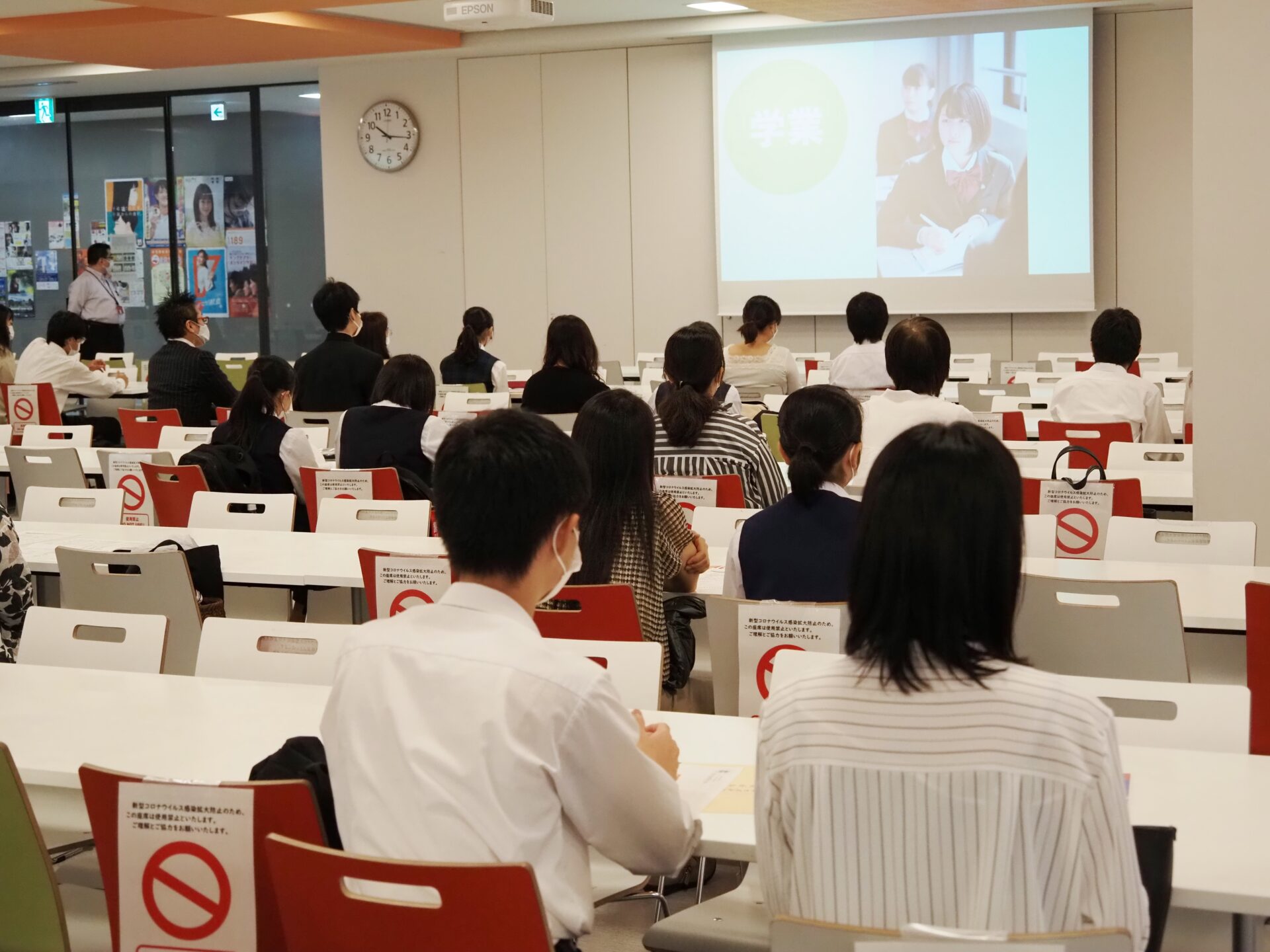 入試相談会では、本校の特色や取り組み・各科コースの説明・入試概要 について説明をしました。その後、いくつかのグループに分かれて施設見学を行ってから、個別相談にご案内しました。