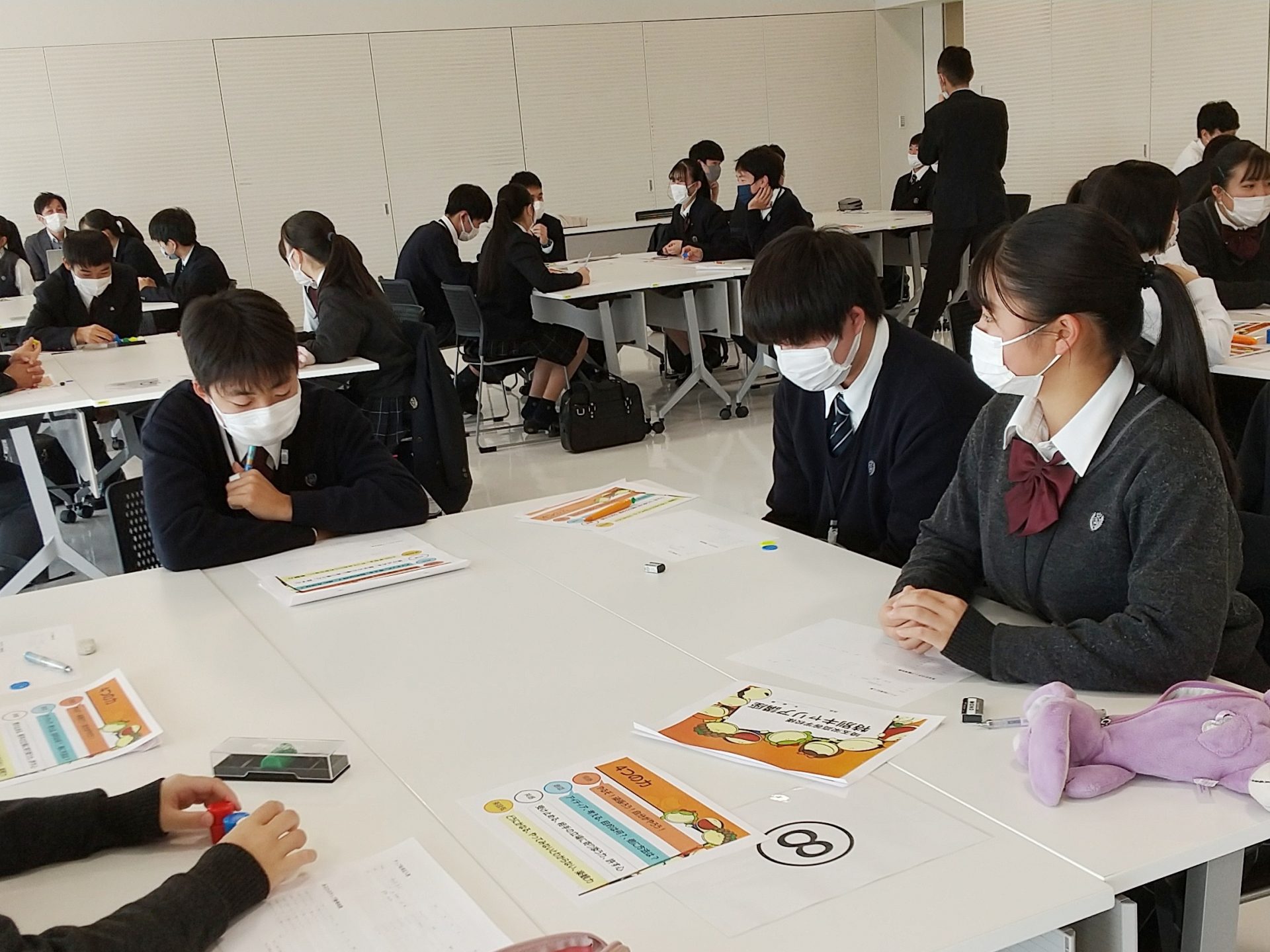 キャリア教育後半は、17の分科会(自然・環境、アート・デザイン、マスコミ・出版、スポーツ、観光、娯楽、輸送、アパレル・ファッション・ビューティー、食品、国際関係、医療・福祉、教育、保育、行政・法律、金融・ビジネス、IT・科学技術・ものづくり、教育)に分かれて、実際に働く社会人の方に各教室で講義をしていただきました。生徒たちは、予め各科会の中から自身が興味を持った3分野を選択。各教室で、講師の話に耳を傾けて熱心にメモを取っていました。
