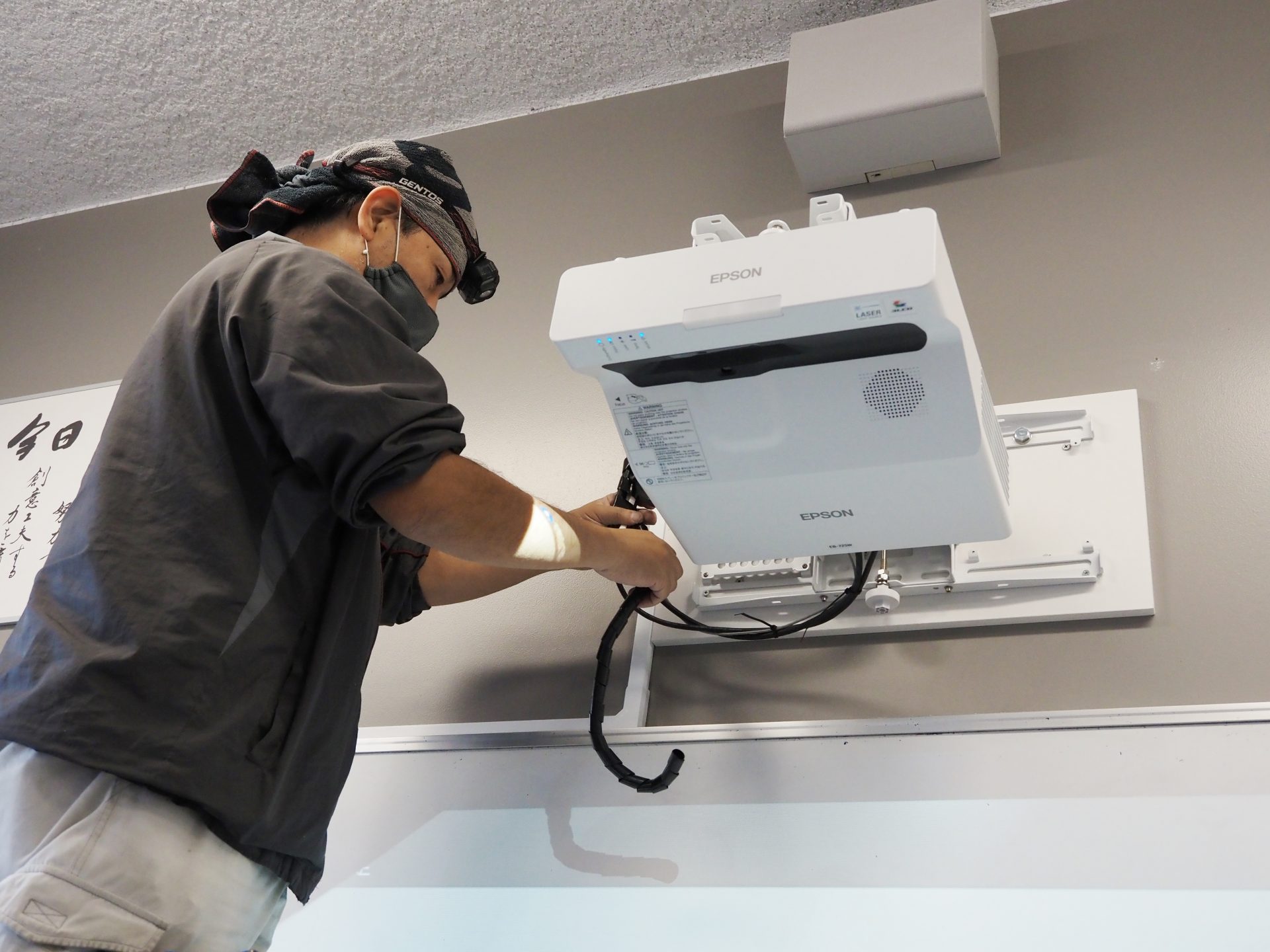 これまで教室にあったテレビは46インチでしたが、レーザープロジェクターでホワイトボードへ投写した際は、90インチの大画面になります。また、従来の天井吊り下げタイプは、ホワイトボードの前に人が立つと影が落ちましたが、今回設置したレーザープロジェクターは、超短焦点モデルのため、ホワイトボードの真上に設置でき、映像の前に人が立っても影が落ちません。パソコン等の接続機器は、教室の壁埋め込み型HDMI・VGA端子差込みを介して、レーザープロジェクターにつなげられます。