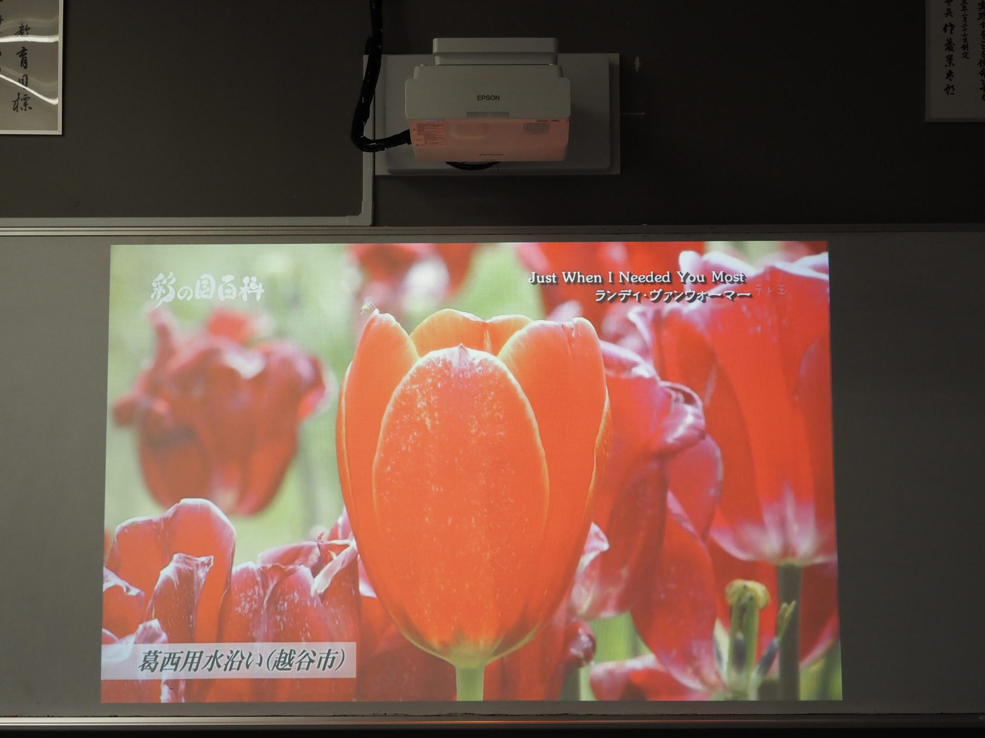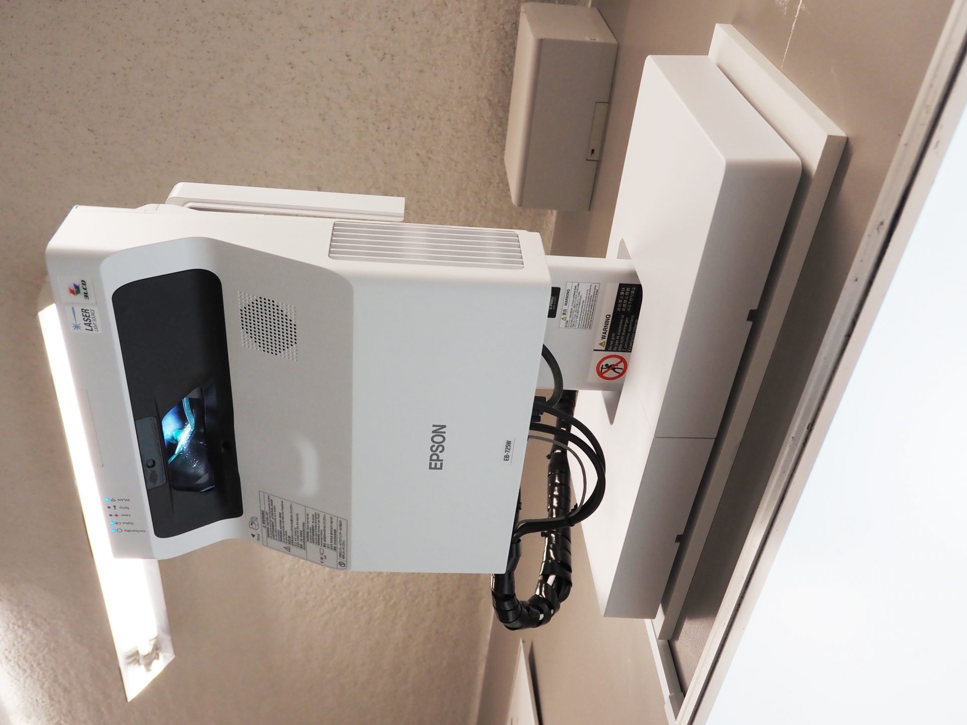 短焦点レーザープロジェクターを中学校2学年の教室に設置しました。今後は、段階的に中学高校の全クラスに設置していきます。