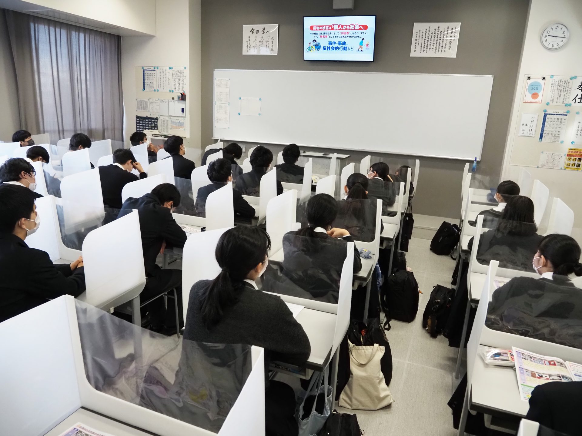 生徒たちが、真剣にテレビ画面を見つめ、しっかりとした態度で講義を受けている姿が印象的でした。