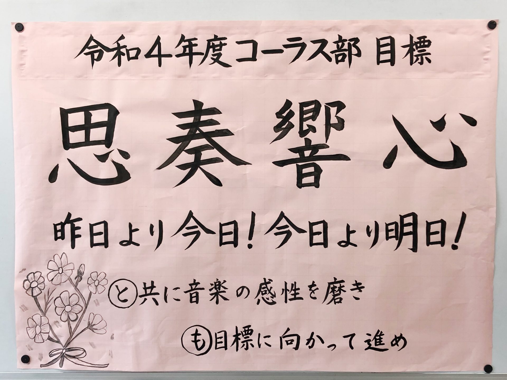 本年度も本校コーラス部から依頼を受け「令和4年度 コーラス部 目標」を書きました。今年度は2・3年生が中心となり、協力して書き上げました。作成したものは毎年、音楽室に掲示しています。