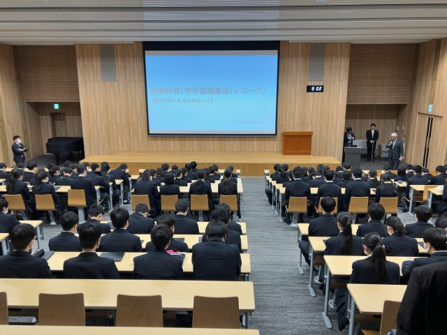 3月12日(火)~14日(木)の期間、普通科1学年を対象にした進路集会をコース (特進・S・α) 別に実施しました。各集会では、学年末試験後からの学習の取り組み方について話をしました。