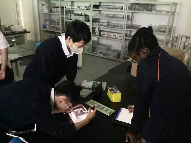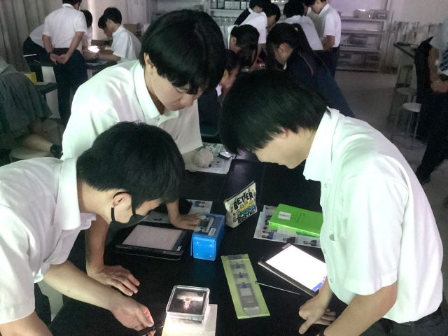 6時限目は、実習を中心に行いました。まず班ごとに霧箱を用いて、放射線を実際に観察しました。初めて目にする放射線に驚きの声が上がり、写真や動画を撮影する生徒も多くいました。生徒たちは、放射線の飛跡の長さや、数を測定することで、放射線の性質を確かめました。