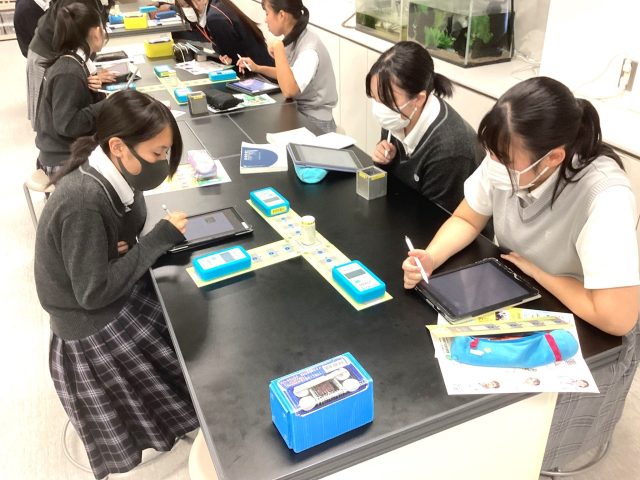 その後、簡易放射線測定器の「はかるくん」を使い、放射線源からの距離と放射線量との相関関係を確かめました。同じテーブルでも位置によって線量が変わることや、距離が離れたときに線量が小さくなることを確認することができました。また、測定器と放射線源の間に物質を置くと放射線が弱まることも確認できました。
