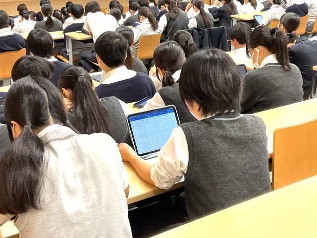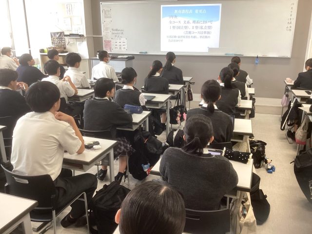 Ⅰ型は主要6教科8科目受験に対応できるカリキュラムで、その内容から国公立受験を視野に入れたコースであること、Ⅱ型は文理それぞれの主要3科目を中心としたカリキュラムで、私大をはじめとした3教科型受験を希望する生徒に適したコースであることを伝えました。生徒たちは終始真剣に聞き入り、進路選択に対する考えを、今まで以上に深める事ができました。