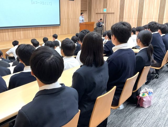 10月17日(木)に2学年αコース生徒を、10月23日(水)に1学年αコース生徒を対象に、Ⅰ・Ⅱ型カリキュラム選択説明会を実施しました。"大学での学び"に焦点を当て、進路を適切に選択するのに必要な学びのスキルや学びに対する姿勢、Ⅰ型(国公立)・Ⅱ型(私立)カリキュラムの概要について話をしました。