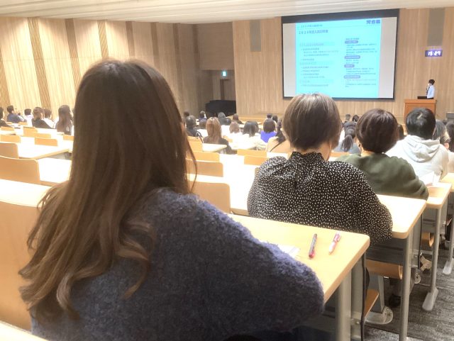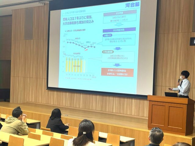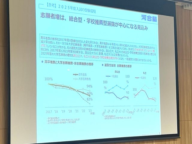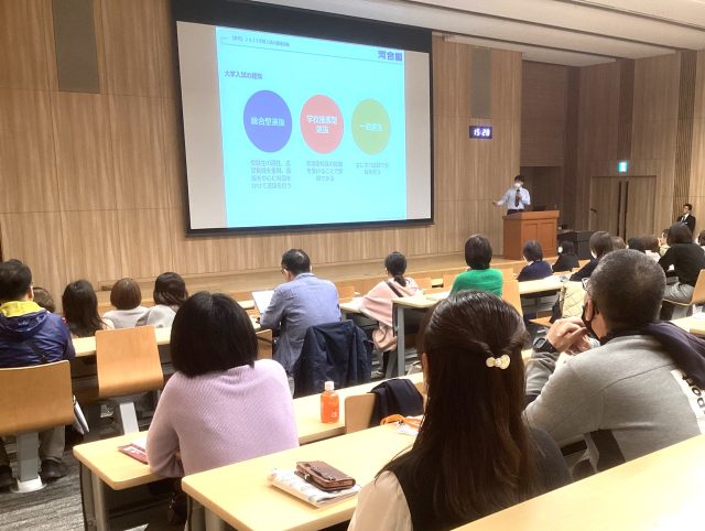 共通テスト、二次・私大試験の概要や傾向、大学及び大学入試に関する特色や今年度の変更点などの統計を元に、今から取り組むべき課題や持つべき心構えなどのお話がありました。1・2年生の時点で受験校プランニングを行い、志望大学の決定や受験に向けたスケジュールや中間目標の計画立てをする必要性を説明しました。さらに、共通テストの出題範囲は約7割が1・2年生の内容であるため、今から基礎固めをすることなどの助言がありました。また、受験に向けた心構えとして、生徒は"挑戦志向"を、保護者は生徒の"主体的な学習をサポートする姿勢"をそれぞれ持って、受験に立ち向かう姿勢が大切であるという内容のお話がありました。