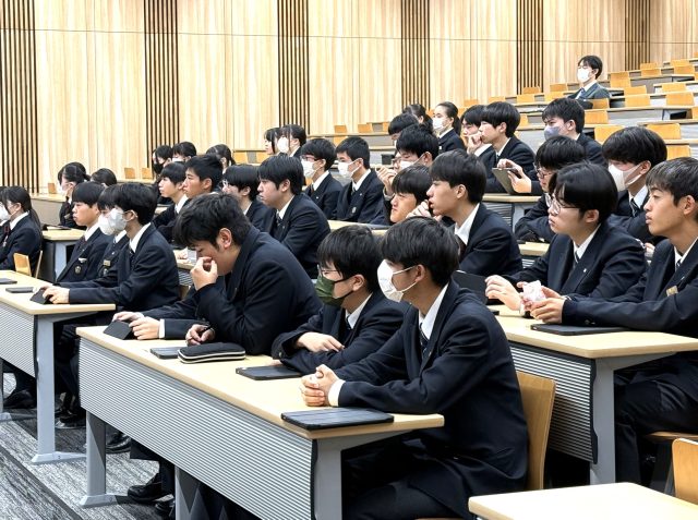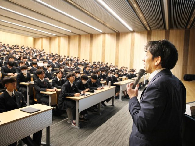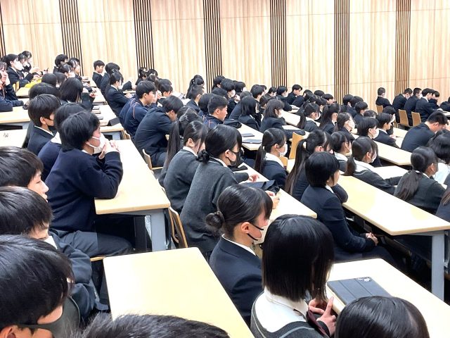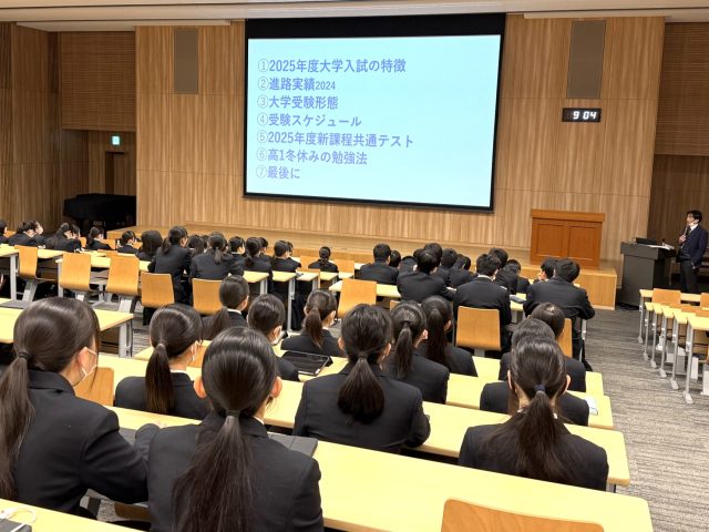 12月19日(木)、20日(金)の2日間、大教室にて普通科1・2学年を対象にコース別進路集会を実施しました。進路集会では、近年の大学入試の動向や入試形態、受験スケジュール、英検等の加点対象資格、冬期休暇・入試期間・3学期に取り組むべき学習について説明ました。