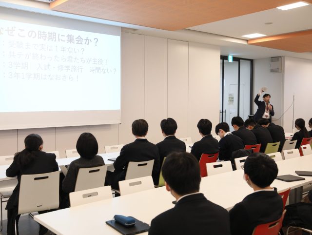 2学年を対象とした集会では、2年生は1年後に受験を控えた受験生であることを伝えました。加えて、受験に向けた5教科の長期的な学習プランや、受験に臨む上で必要な姿勢・考え方を説明しながら「2年3学期」ではなく「3年0学期」という意識で受験生活のスタートを切ることの大切さを説明しました。