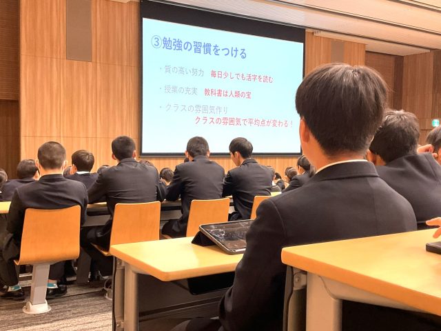 1学年の集会では、大学入試動向などを踏まえて、1年生の「今」から受験を視野に入れた学習をすることの重要性や、国数英の3教科を例に、冬期休暇や入試期間に取り組むべき具体的な学習内容を説明しました。また、自分自身や周囲の人々のため、社会の一員として成長することの大切さを伝えました。