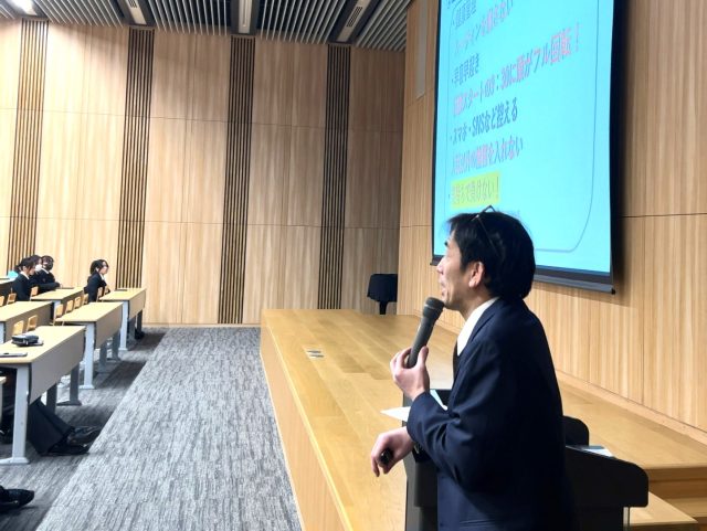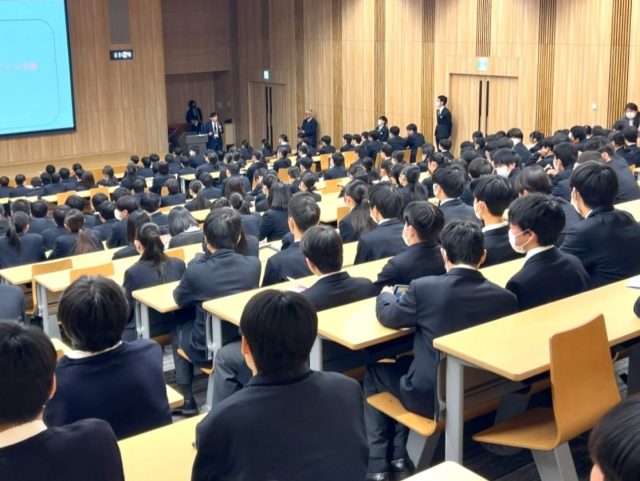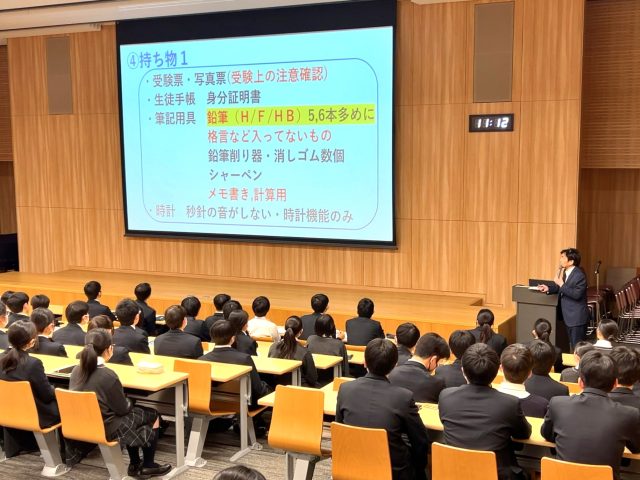 1月8日(水) 放課後、大学入学共通テストを受験する3学年生徒を対象に、大教室にて直前集会を実施しました。講演では、共通テスト当日までの生活習慣や試験中に注意すべき点、試験後及び追試等の手続きについて話をしました。特に、共通テスト前後のメンタルコントロールについて触れ、平常心で試験に臨むことが大切だと伝えました。10日後に迫った共通テストを前に、生徒たちは緊張しつつも真剣な態度で話を聞いていました。
