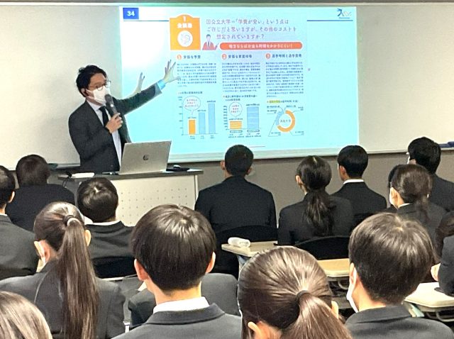 志望校決定に関する学費以外の検討材料の他、模試種別ごとの見方や判断基準や、1年後にフォーカスした学習プランの組み方などに関する話がありました。また、今の時期から6月までをいかに頑張れるかが、ターニングポイントとなると伝えられ、新3年生を鼓舞しました。生徒たちは、受験への具体的なアプローチ方法を得られたことで、よりいっそう受験勉強へやる気が高まったようでした。生徒たちが希望進路に進めるよう、生徒と教師が二人三脚で受験へ臨みます。