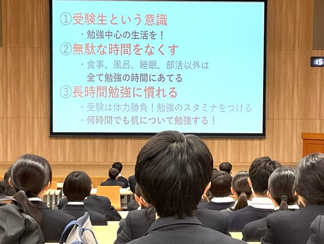 2月25日(火)、26日(水) の放課後、普通科2学年 α・Sコースの生徒を対象に進路集会を行いました。25日は次年度カリキュラムⅠ型(6教科対応型)、26日はⅡ型(3教科特化型)を選択した生徒たちに、次年度に向けて、今後どのように過ごしていくべきかを話しました。