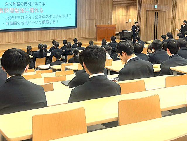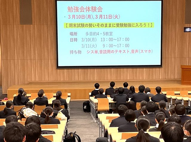 生徒たちには、期末試験対策の学習習慣を春休み以降も継続することで、自然と受験勉強の習慣の確立につなげられる理想的な時期だと伝えました。また、自習室の利用や勉強会への参加についても勧めました。生徒たちの今後の学習内容の質の向上に期待します。