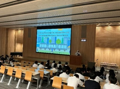 当日は、普通科1年Sコースの生徒120名が参加し、各クラスから選抜されたチームによるプレゼンテーションとグループディスカッションを展開しました。発表後はUber社員からの問いかけに応じ、生徒たちは仲間と意見を交わしながら答えを導きました。