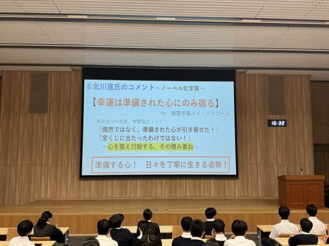 集会の中で、ノーベル化学賞を受賞した北川進氏の、「偶然に成功したわけではない。日々の努力の積み重ねが研究成果につながった」という言葉の紹介とともに、「残りの時間をどう使うかが合否を左右する」「焦らず、日々を積み重ねていくことが何より大切」という進路指導科からのメッセージに、生徒たちは真剣な表情で耳を傾けていました。