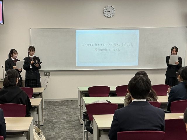 また、α選抜クラスに在籍している生徒から、αコースとα選抜クラスの違いや特徴について、スライドを用いて説明がありました。その後、同様に施設見学と個別相談を行いました。