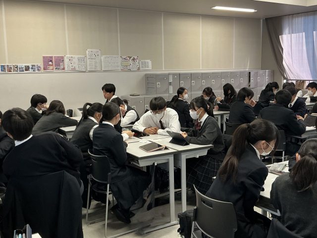 11月10日(月)、1時間目に情操教育の一環として、高校全学年を対象に、「人の印象と行動」について考えるグループワークを行いました。資料を使って各人物の行動から受けた第一印象を話し合い、その後、背景の説明を受けて印象に変化があるかを調べました。