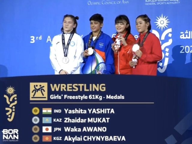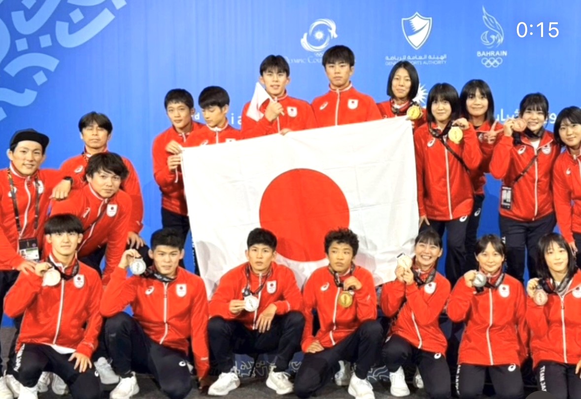 10月28日(火)、29日(水)に、バーレーン・マナマでアジアユースゲームズが実施されました。本校からは、丸田龍平(保3-6)がフリースタイル65㎏級、塩塚温大(普2-2)がフリースタイル80㎏級、粟野和夏(普1-5)が女子61㎏級に出場しました。丸田は2回戦敗退となり、敗者復活戦に回れませんでした。塩塚は初戦を落としたものの、敗者復活戦を勝ち上がり、3位決定戦まで進みましたが、結果は惜しくも敗れ第5位でした。粟野は、1、2回戦で快勝した後、準決勝で敗れましたが、3位決定戦に勝利し、銅メダルを獲得しました。