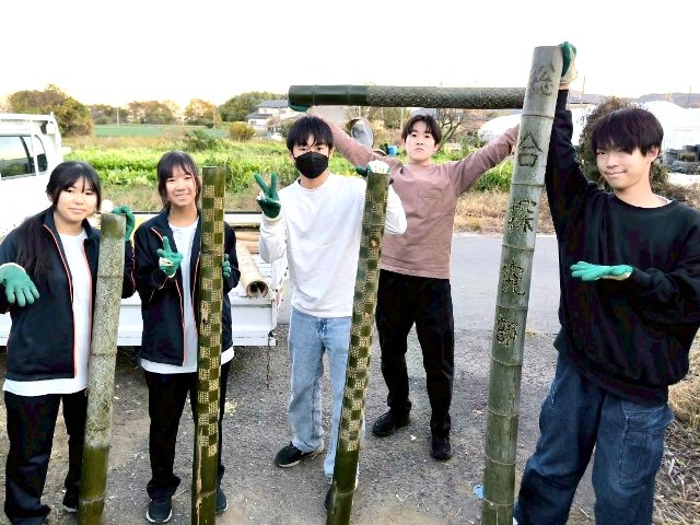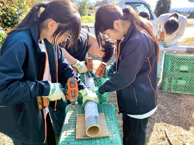 2日目は、伐採した竹を使って竹明かりの制作に取り組みました。インパクトドライバーなどの工具の使い方を教えていただき、「総合探究部」と彫られた竹明かりも完成させました。制作した竹明かりは、現在、寄居町の雀宮公園に展示されています。ライトアップイベントは12月いっぱい開催されていますので、お近くにお越しの際はぜひご覧ください。