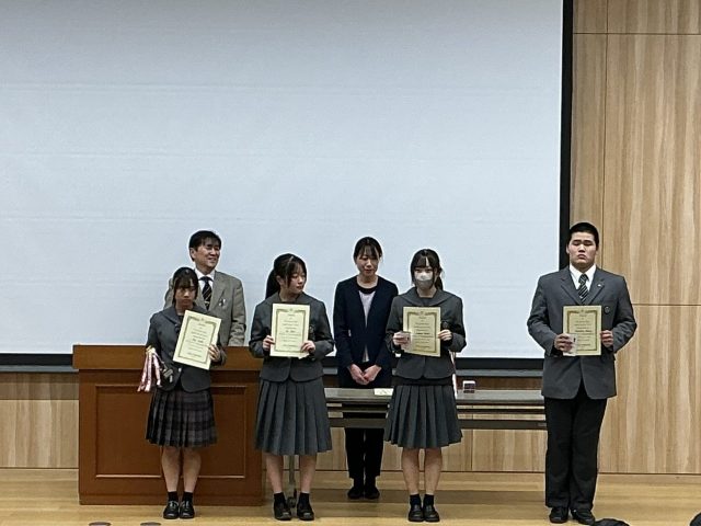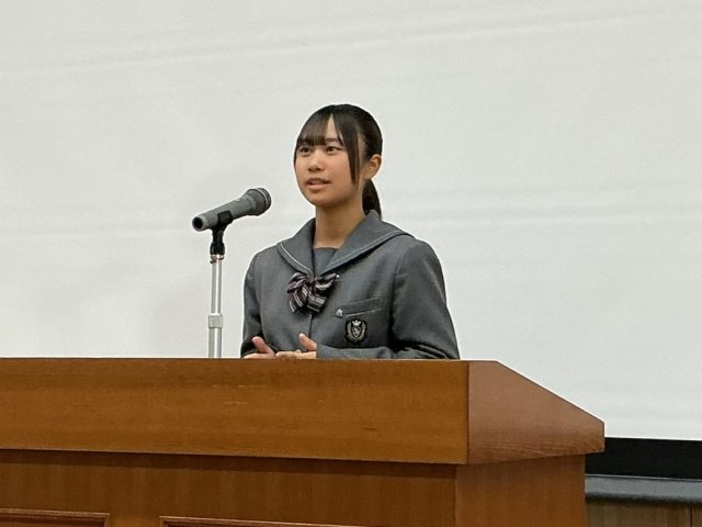 コンテストの審査の結果、グランプリ受賞生徒は、中学部門では小関萌衣さん(3年生)が「英語の上手な学び方」をテーマに、高校部門では松宏祥生さん(2年生)が「人生の転換点」をテーマにしたスピーチで、それぞれ受賞しました。