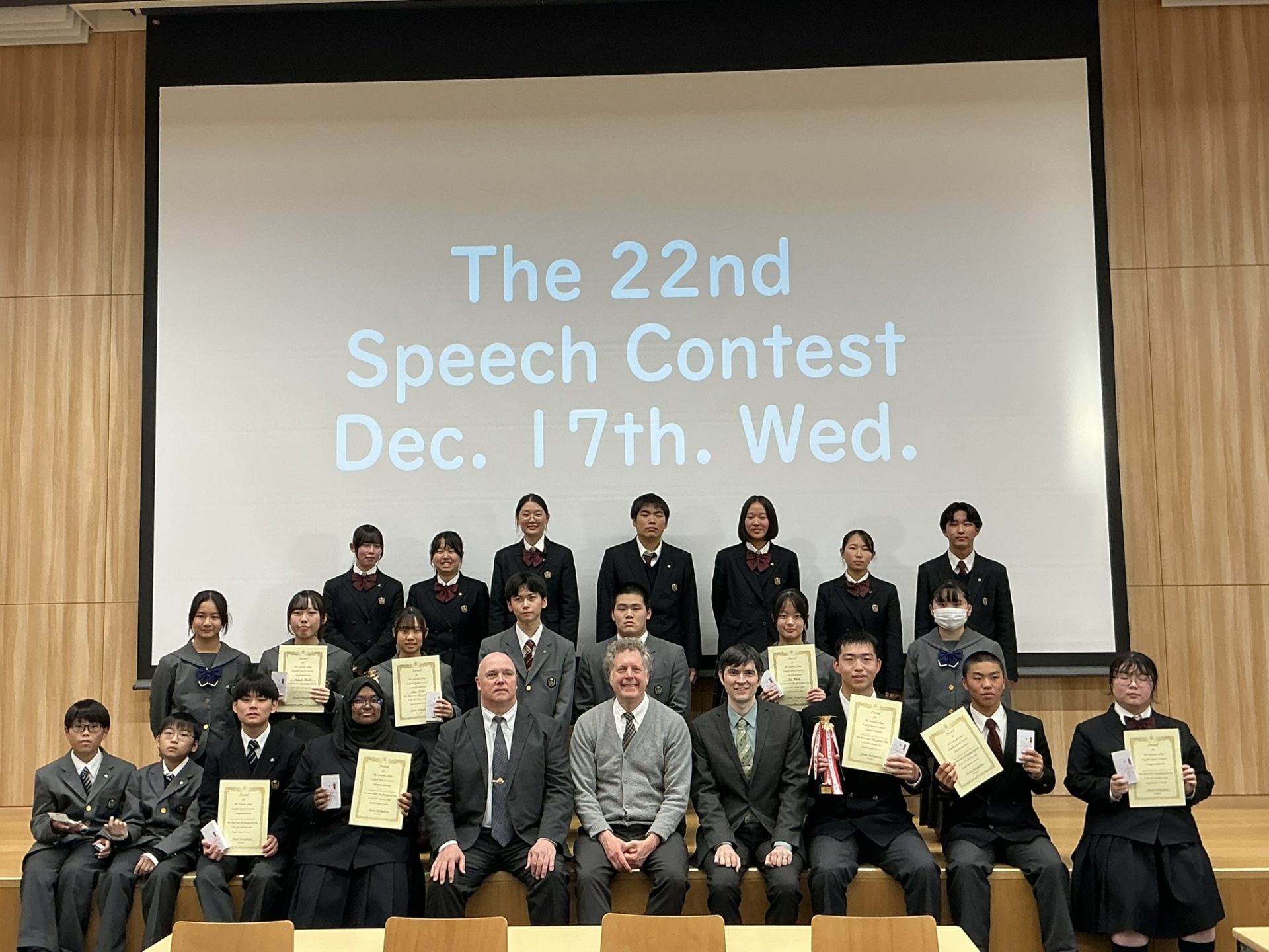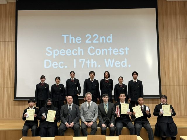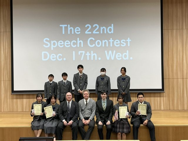 12月17日(水)、第22回中学・高校 英語スピーチコンテストを大教室にて開催しました。当日は21名(中学9名・高校12名)が出場し、日頃の英語学習の成果を存分に発揮しました。スピーチでは、自身の経験や身近な出来事、世界的な課題、部活動など、多彩なテーマが取り上げられました。本年度は高校1・2年生の出場希望者が多く、事前オーディションを通過した生徒のみが出場したことから、例年以上にレベルの高いコンテストとなりました。