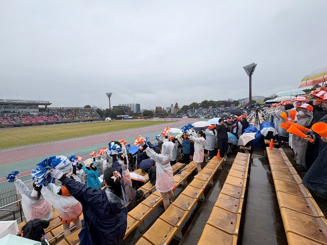 12月21日(日)、本校男女駅伝部が出場した全国高等学校駅伝競走大会の応援のため、たけびしスタジアム京都に行きました。悪天候の中、応援団・吹奏楽部と協力しながら、選手たちに力強い声援を送りました。競技場には多くの観客や他校の応援団がいましたが、それにも負けない迫力ある応援を行うことができました。