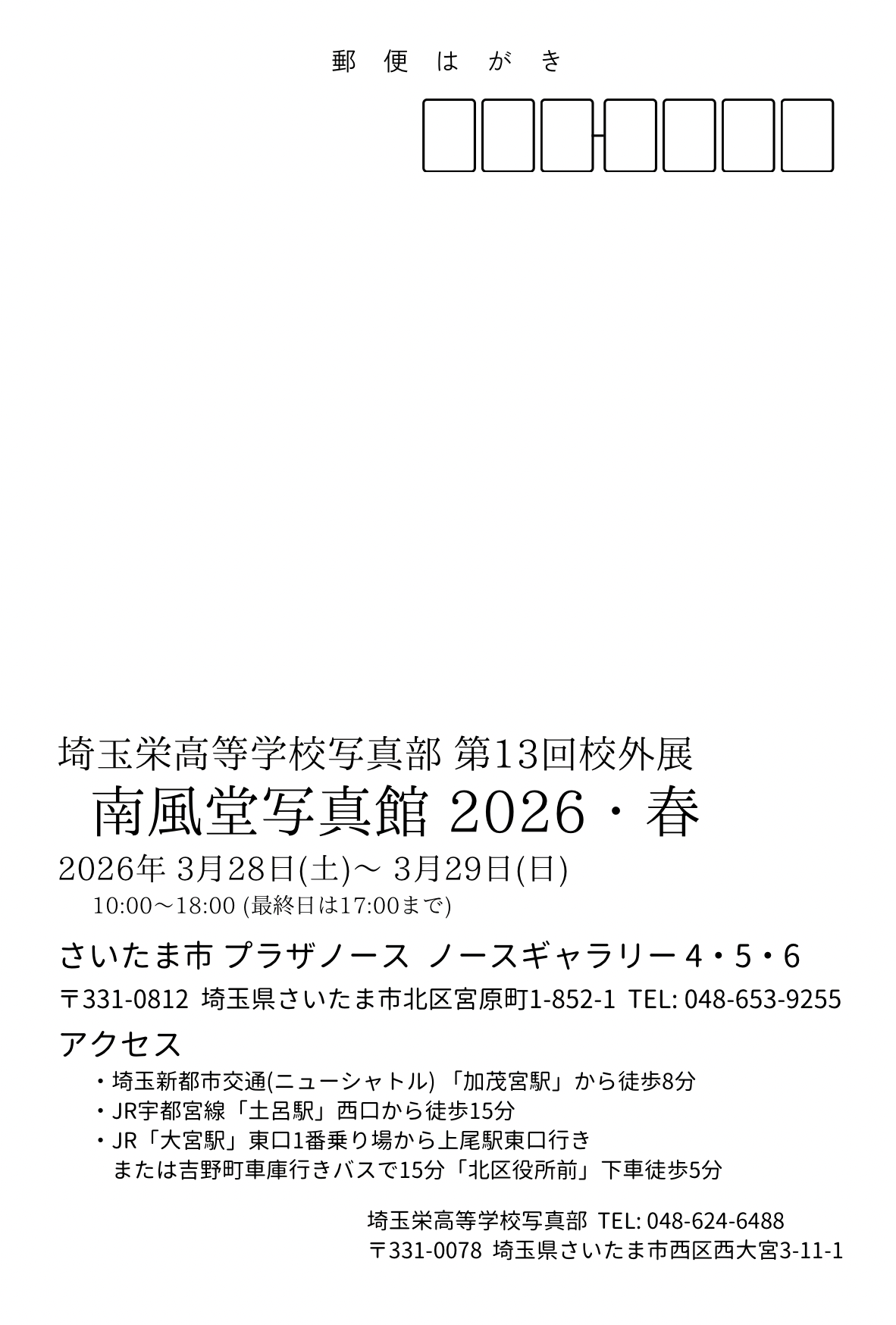 3月28日(土)・29日(日)の10:00~18:00 (29日は17:00まで) には、第13回校外展『南風堂写真館2026・春』を、プラザノースで開催します。保護者の皆様をはじめ、日頃からお世話になっている方々に「来てよかった」と思っていただける、そして今後も末永く応援していただける写真展を開催できれば幸いです。部員一同、皆様のご来場を心よりお待ちしております。