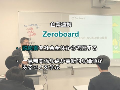 2月21日(土)、キャリアイノベーション同好会は、株式会社ゼロボードより代表取締役の渡慶次 道隆さまをお招きし、特別授業を実施しました。講義は「これまでのキャリア(自分史)」と「企業による脱炭素への取り組み」の二部構成で行われました。