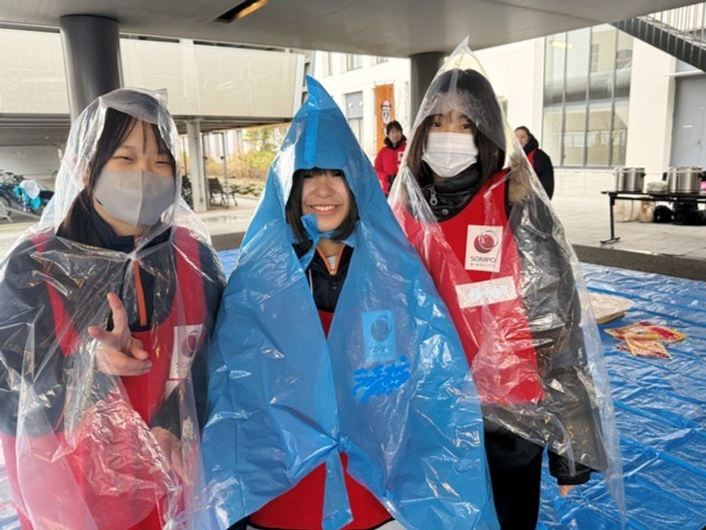 当日は4つのグループに分かれ、5つのプログラムを順番に体験してもらいました。内容は、新聞紙を使った食器づくりや、ごみ袋を利用したポンチョづくりなど、災害時に役立つ実践的な活動です。また、本校を避難所と想定した炊き出しも行い、実際に自分たちで作った食器を使って食事をしました。