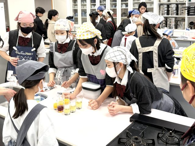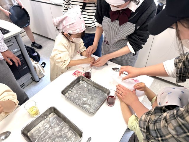 体験では、材料となるジュース選びから、ゼラチンを溶かし、冷やして固め、型を抜くまでの工程を、部員がサポートしました。はじめは生徒も子どもたちも緊張した様子でしたが、次第に打ち解け、楽しみながら手作りの魅力を伝えることができました。