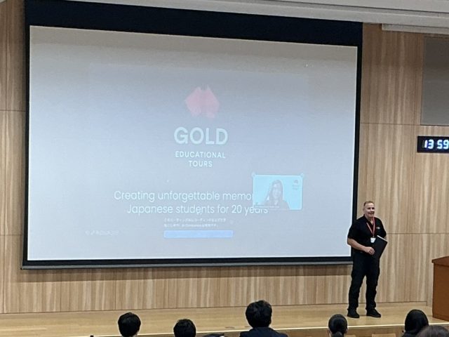 今回は、現地パースより、ゴールドエデュケーショナルツアーズより、スコット先生にご来校いただき、現地の様子やプログラム内容について詳しくご説明いただきました。また、昨年度本研修に参加した普通科3年生が、ホームステイ先での生活や現地校での体験について発表しました。