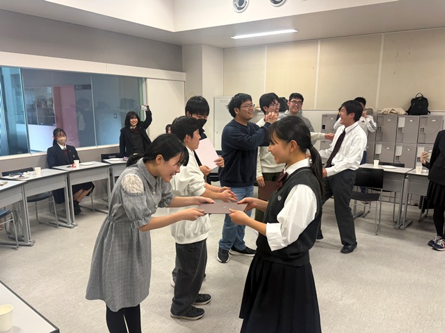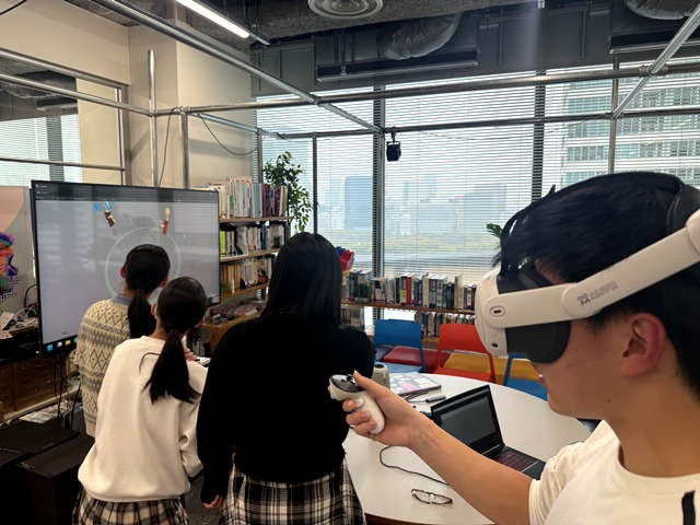 VR体験後は、グループに分かれて、「未来のコミュニケーション」をテーマにディスカッションと発表を行いました。遠隔の人との触覚の共有という技術を応用したぬいぐるみや、月と地球間でのコミュニケーションなど、おもしろいアイディアを提案することができました。