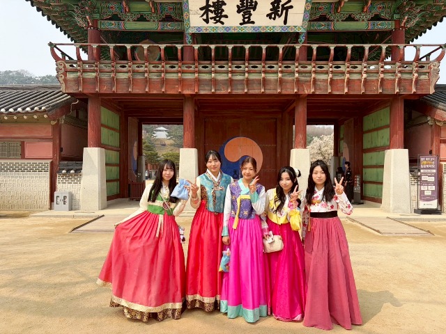 現地ではホストファミリーに温かく迎えられ、ソウル市街でのショッピング、伝統衣装である韓服を着て世界遺産である水原華城を巡ったり、人気のアミューズメントパークであるエバーランドを現地の学生と回りました。他にも現地の高校を訪れ、日韓のポップスに合わせたダンスなどの出し物を発表して交流しました。短期間の滞在でしたが、ホストファミリーとの間には絆も芽生え、別れの際にはお互いに涙する場面もありました。
