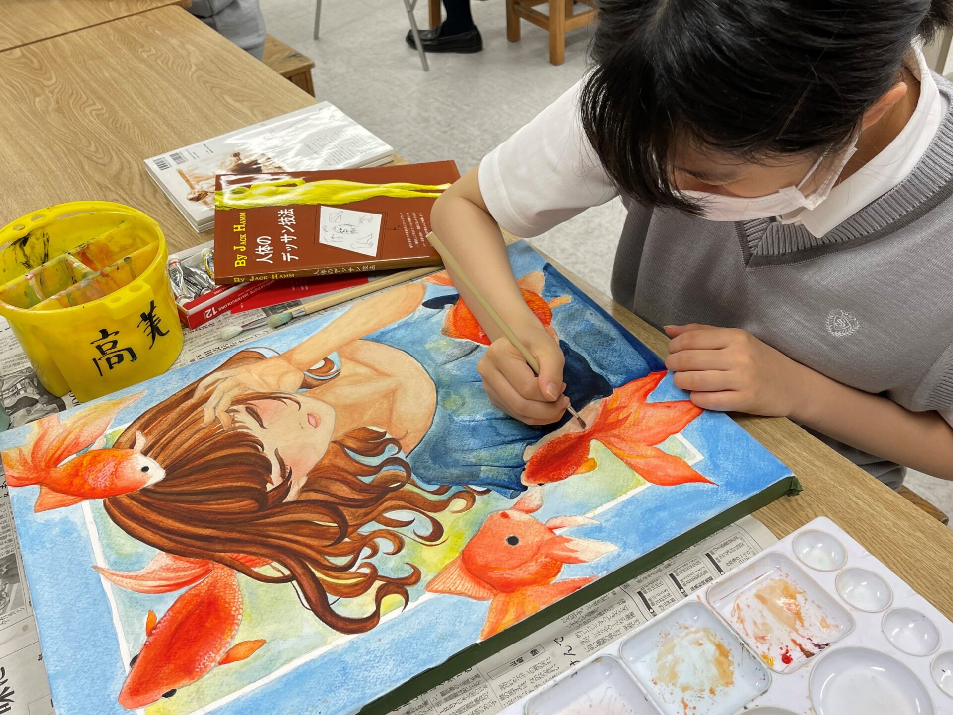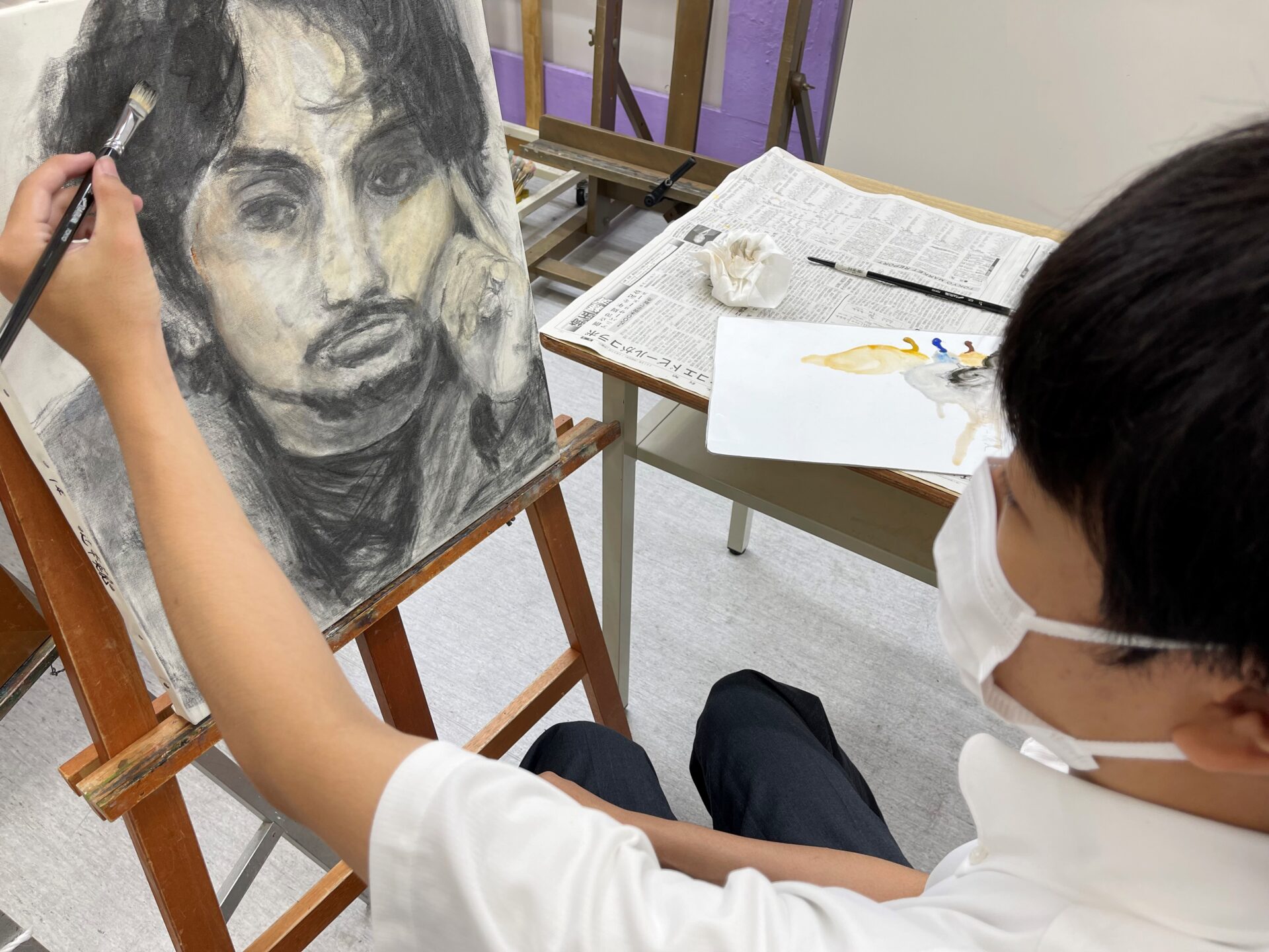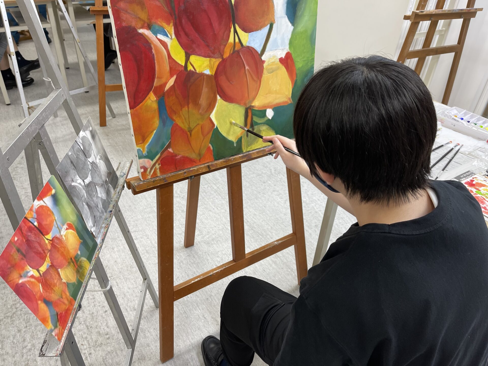 1年生は、入部して最初の作品を引き続きじっくり制作する部員もいれば、次の作品に取り取り掛かる部員も徐々に増えてきました。作品のジャンルも、油絵や水彩、立体モビールなど、表現したい作品を制作しています。2・3年生は、大作に取り組む部員が出てきたり、中学生部員も作品制作に活発に参加しはじめ、美術部全体が活性化しています。
