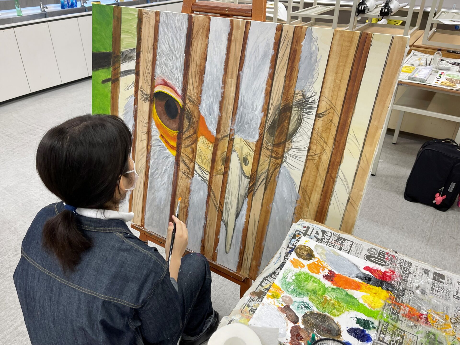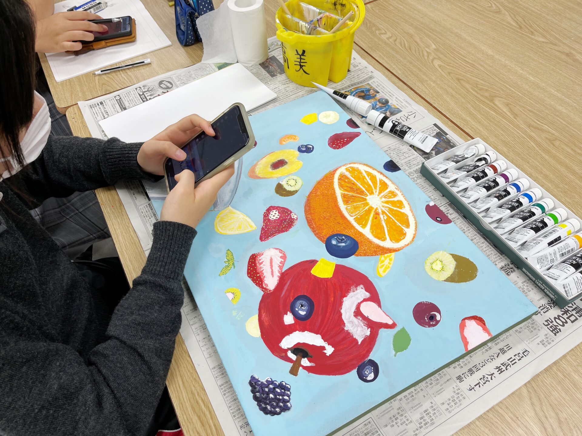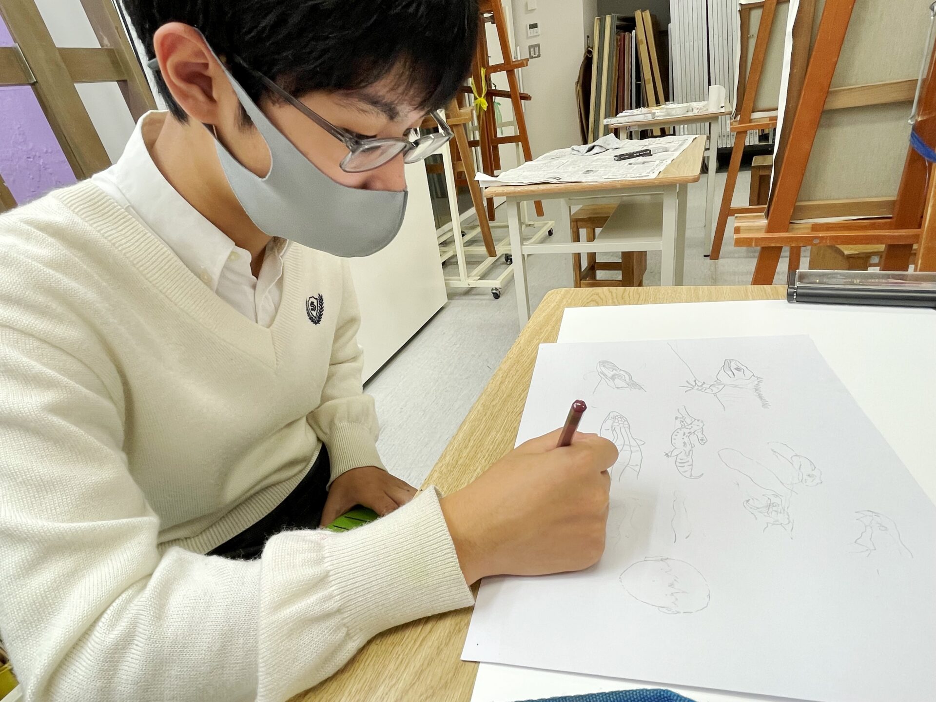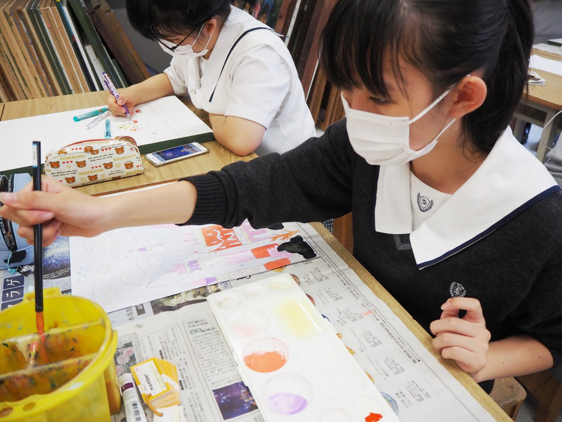 1年生は、入部して最初の作品を引き続きじっくり制作する部員もいれば、次の作品に取り取り掛かる部員も徐々に増えてきました。作品のジャンルも、油絵や水彩、立体モビールなど、表現したい作品を制作しています。2・3年生は、大作に取り組む部員が出てきたり、中学生部員も作品制作に活発に参加しはじめ、美術部全体が活性化しています。