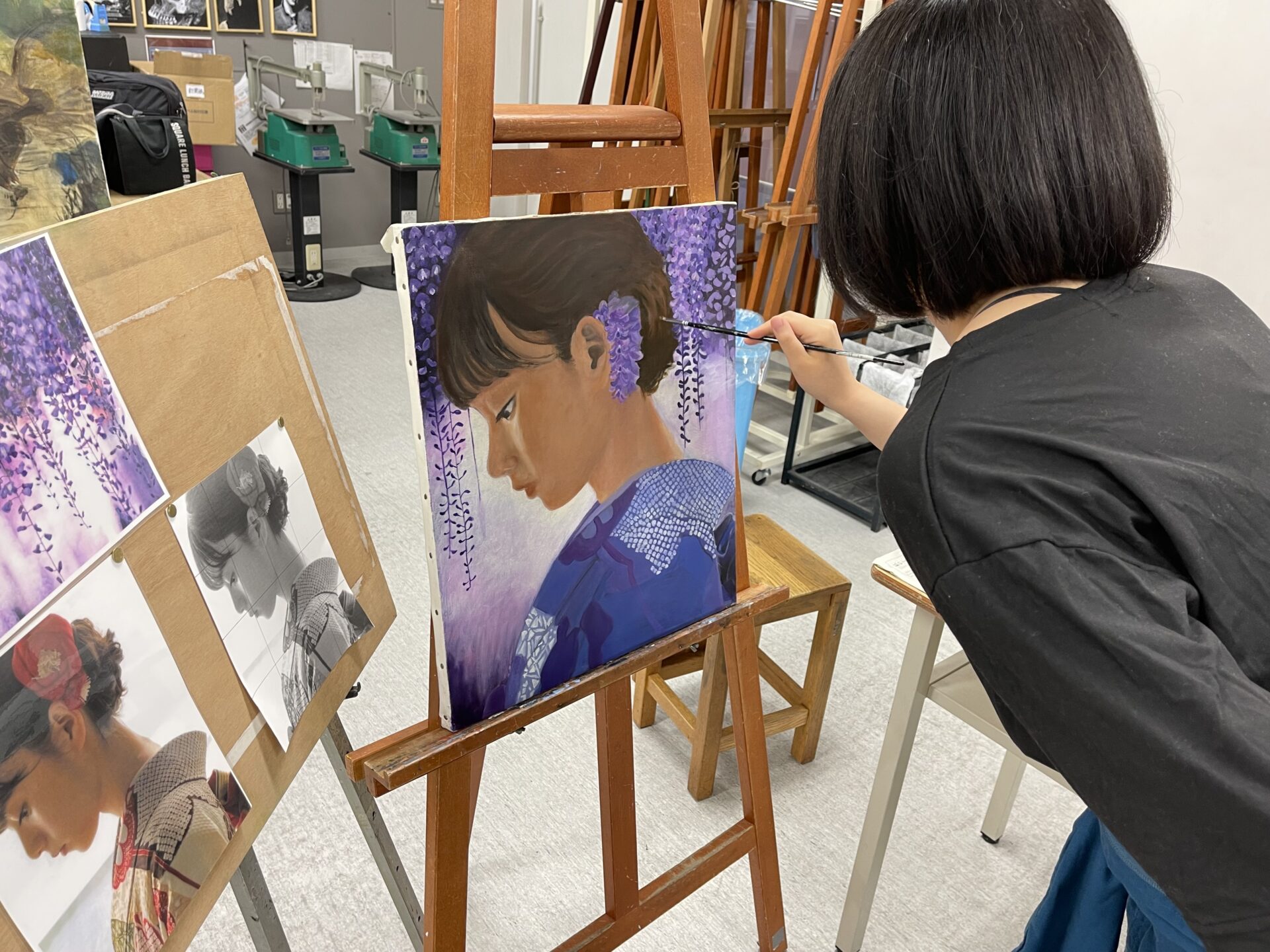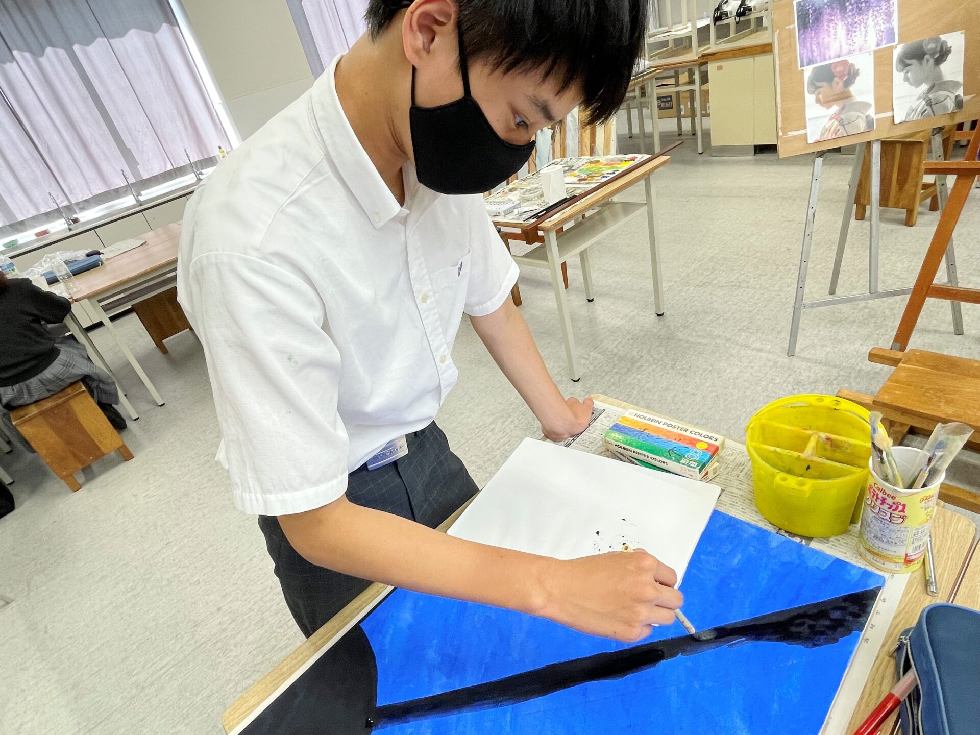 美術部の夏休み期間の作品制作は、校内の夏期講習期間に、部員が個々でスケジュールを組んで、無理のない範囲で制作できるようにしています。部員が都合の良い時間帯に入れ替わりで制作をするため、時間帯によってメンバーが異なる活動スタイルです