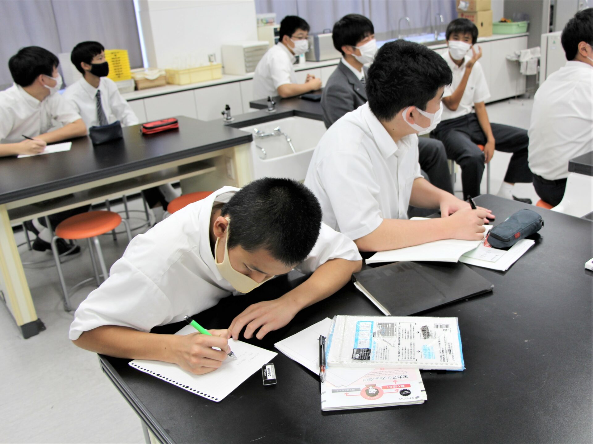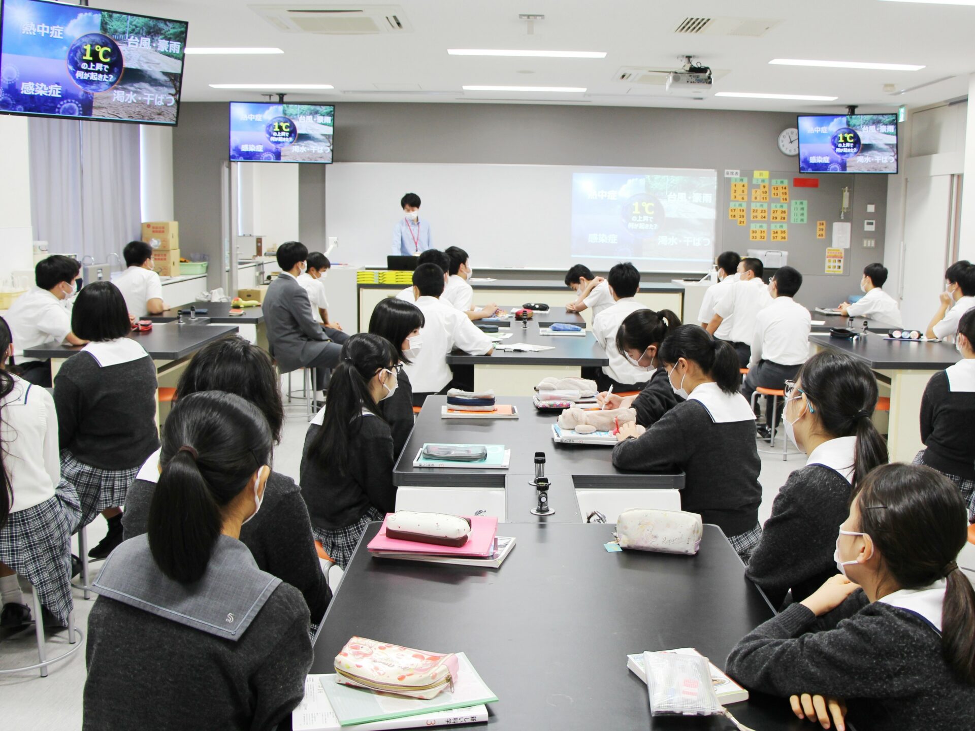 1時間目は、地球温暖化による環境問題について講義がありました。生徒たちは、今までの学習で得た知識を思い出しながら、講義に臨んでいました。