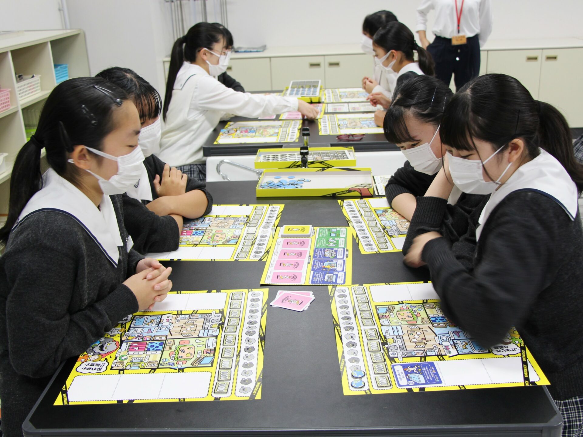 カードから二酸化炭素削減のための行動を選び、自分の家庭に置き換えて行動宣言をし、ポイントを獲得していくものでした。 生徒はお金を使ってたくさんポイントを得るのか、ポイントは少なくてもお金をかけずに行動するのか、それぞれ作戦を立ててゲームに取り組みました。