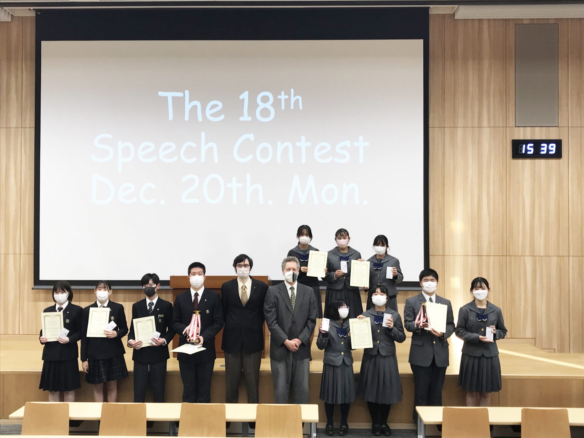 12月20日(月)、第18回 中学・高校 英語スピーチコンテストを本校大教室にて実施しました。昨年度は感染症拡大防止対策のため、録画審査でコンテストを行いましたが、今年度は保護者・教職員のみの観客が見守る中、中高合わせて42名の出場者たちが英語スピーチを披露しました。