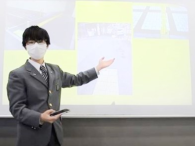 尾関君のプレゼンテーマは「骨伝導イヤホンで目の見えない人に優しい街づくりを」です。骨伝導イヤホンによる音声ガイドで、点字ブロックの問題点を解決するアイディアを提案しました。