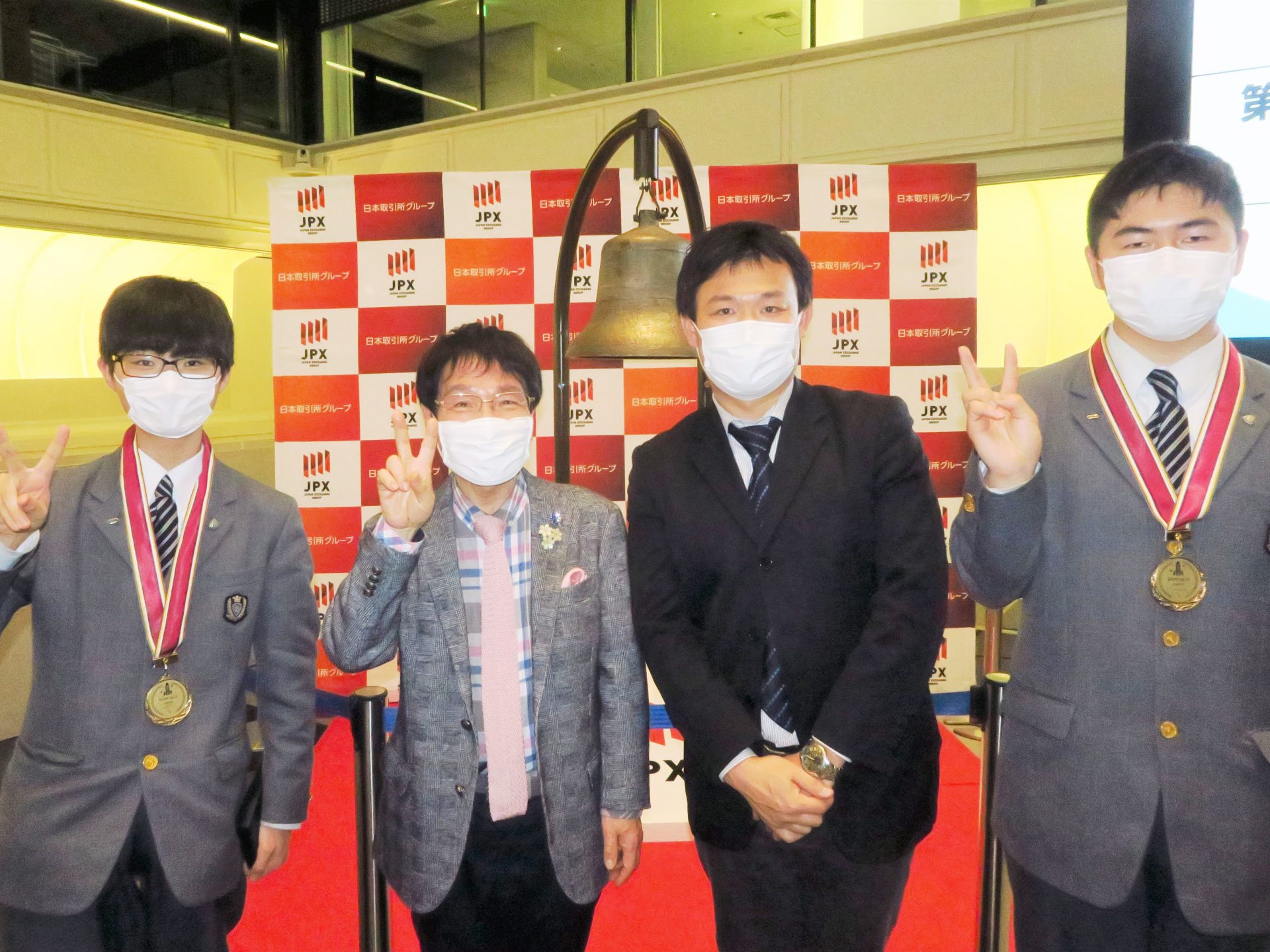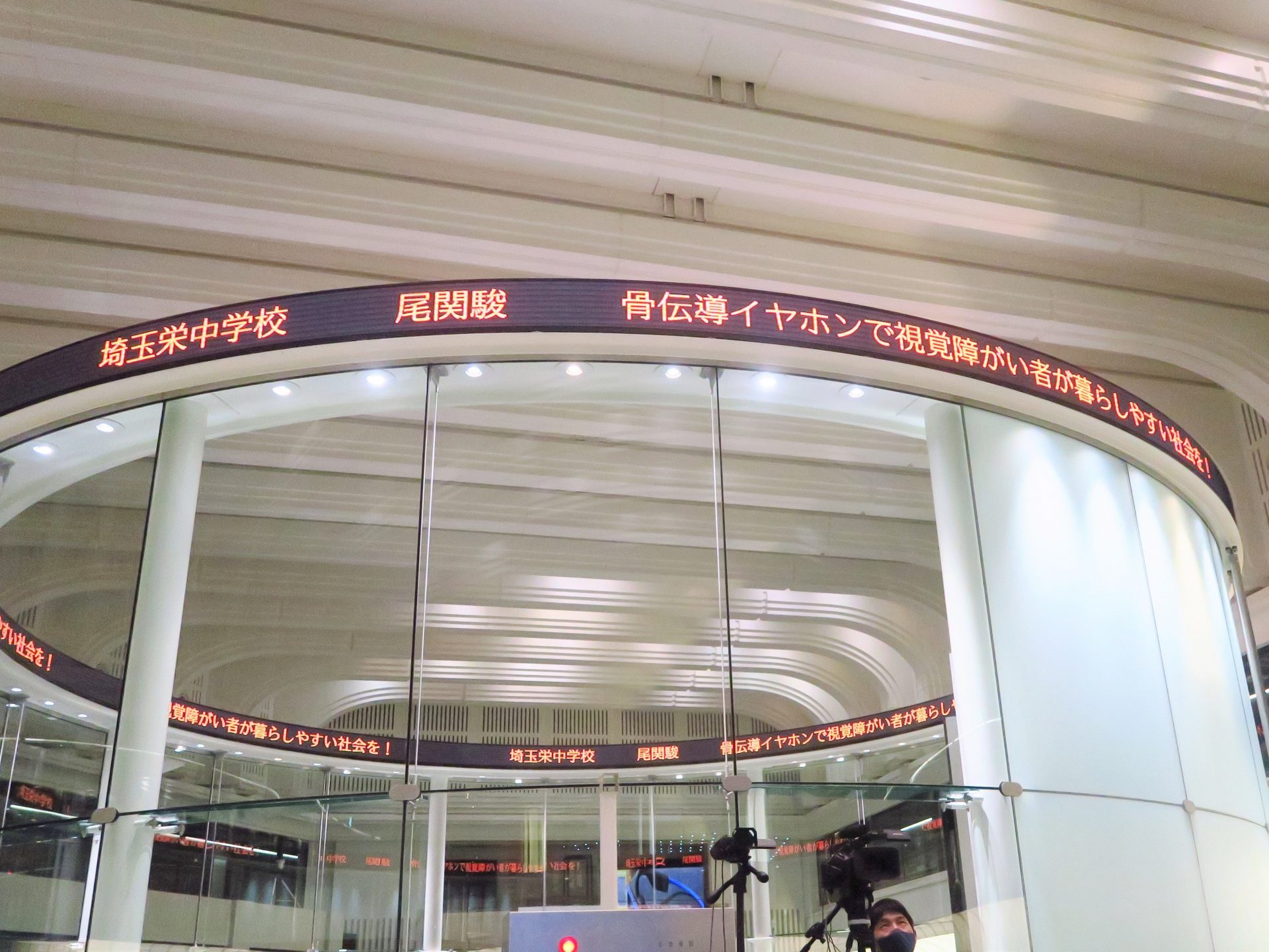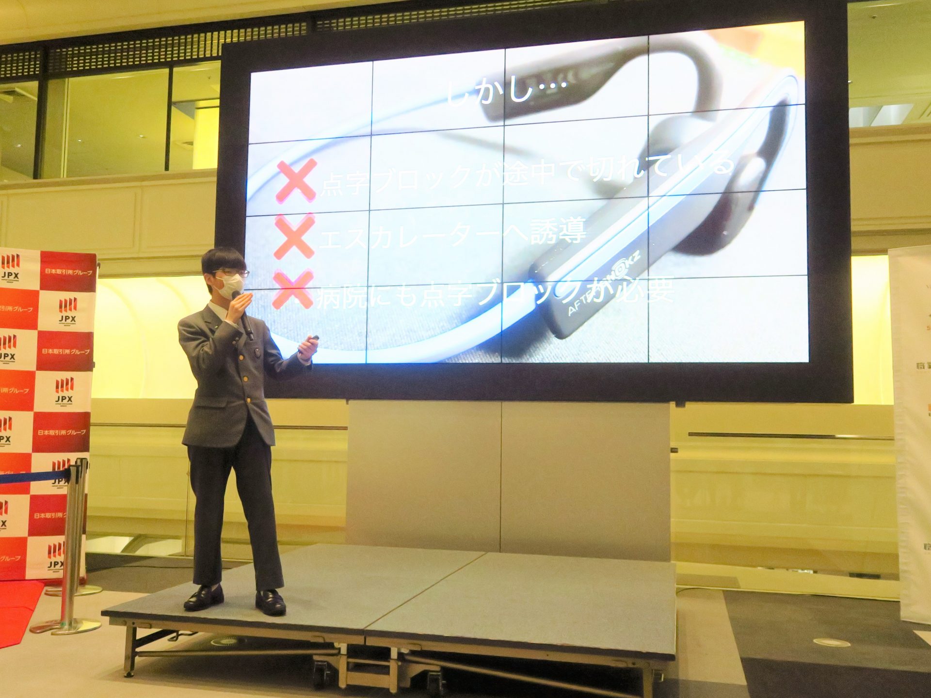 3月6日(日)、東京証券取引所にて、「スタートアップ Jr. アワード 2021」プレゼンテーション全国大会の決勝が行われました。本校からは、2年生の尾関君と松井君が出場しました。プレゼンテーマは、尾関君が「骨伝導イヤホンで視覚障がい者が暮らしやすい社会を!」、松井君は「雑草を再生紙に加えることは可能か?」です。会場全体に漂う緊張感の中、部員二人はこれまでの練習の成果を発揮して、堂々と発表することができました。プレゼンテーション中は、株価が表示される電光掲示板に、発表者の氏名とテーマが表示される演出がありました。