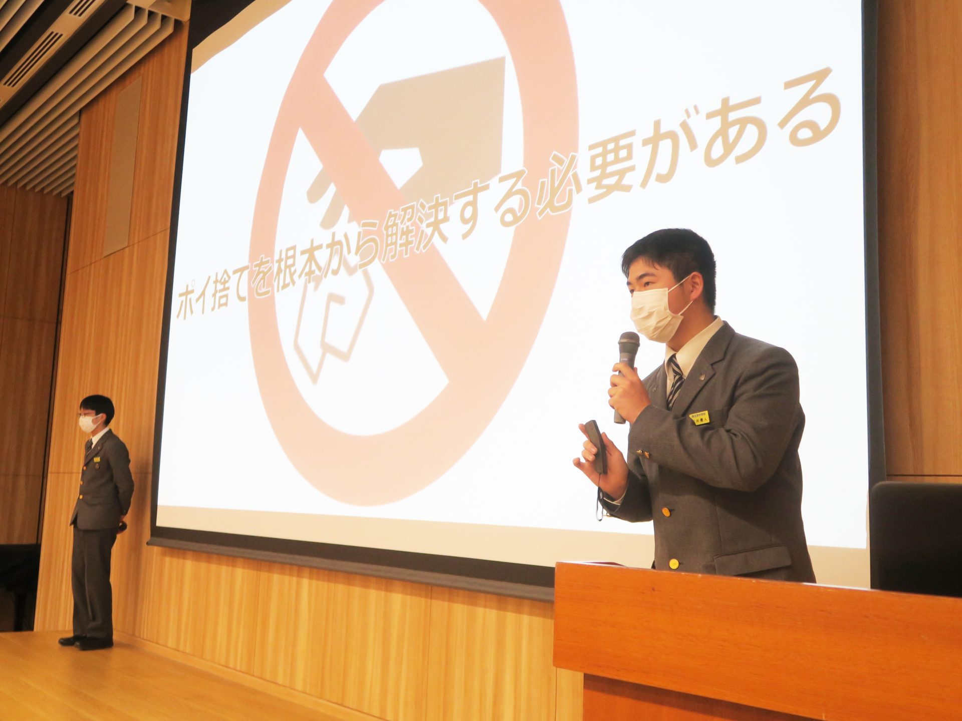 1組目の 松井君と高梨君のチームは、東京都の海洋汚染の取り組みを例に、日常生活における今するべき対策について述べました。