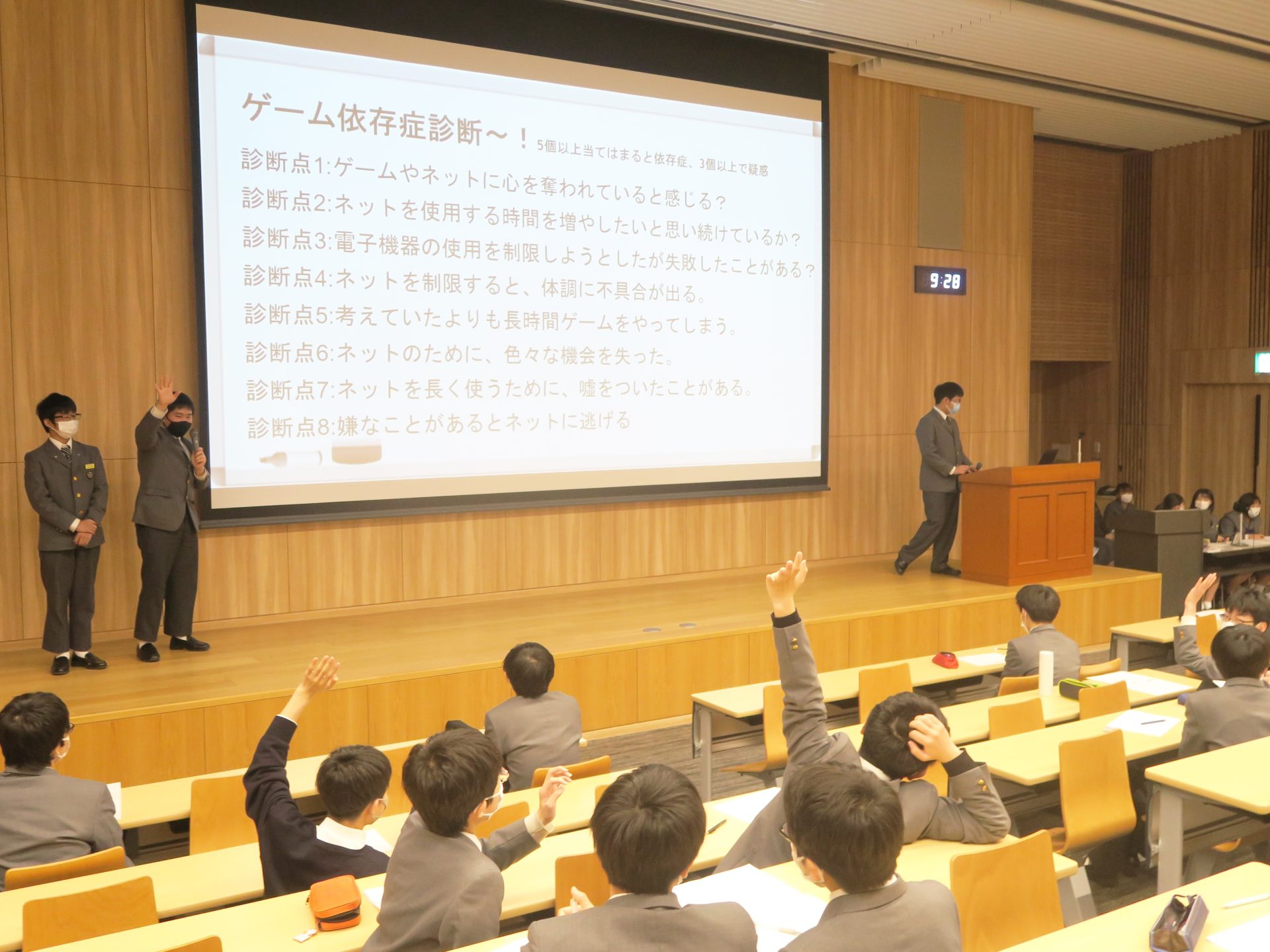 2組目の大場君、増川君、杉田君は、ゲーム依存の危険性と更生施設の過酷な現状を伝えました。ゲーム依存症診断を行うなど、興味を引く発表でした。