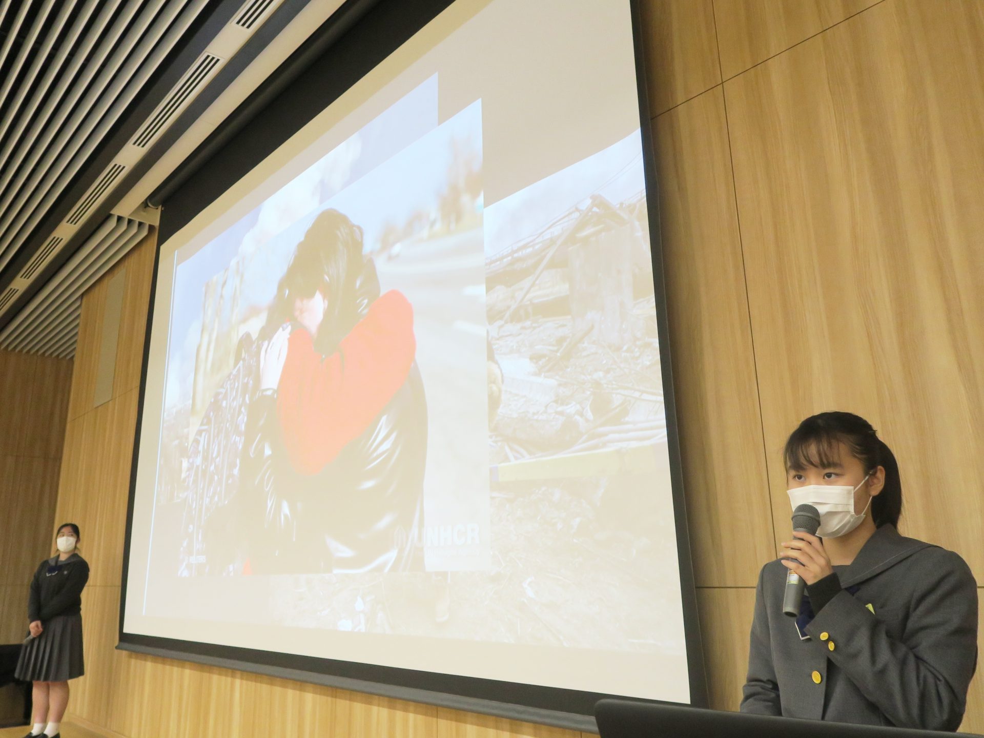 3組目の坂本さん、相田さん、青木さんは、アフガニスタンのタリバン政権下で起こっている人権侵害について発表しました。平和な日常が、ある日突然奪われる恐怖を伝えました。