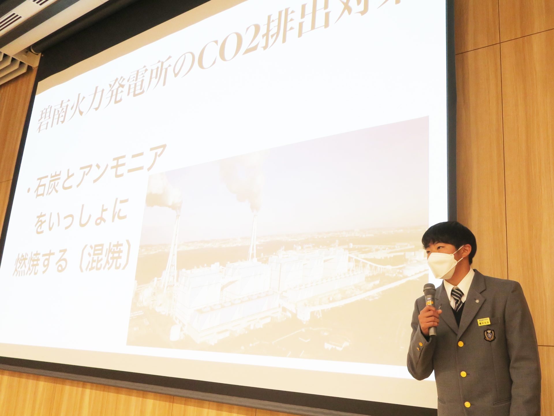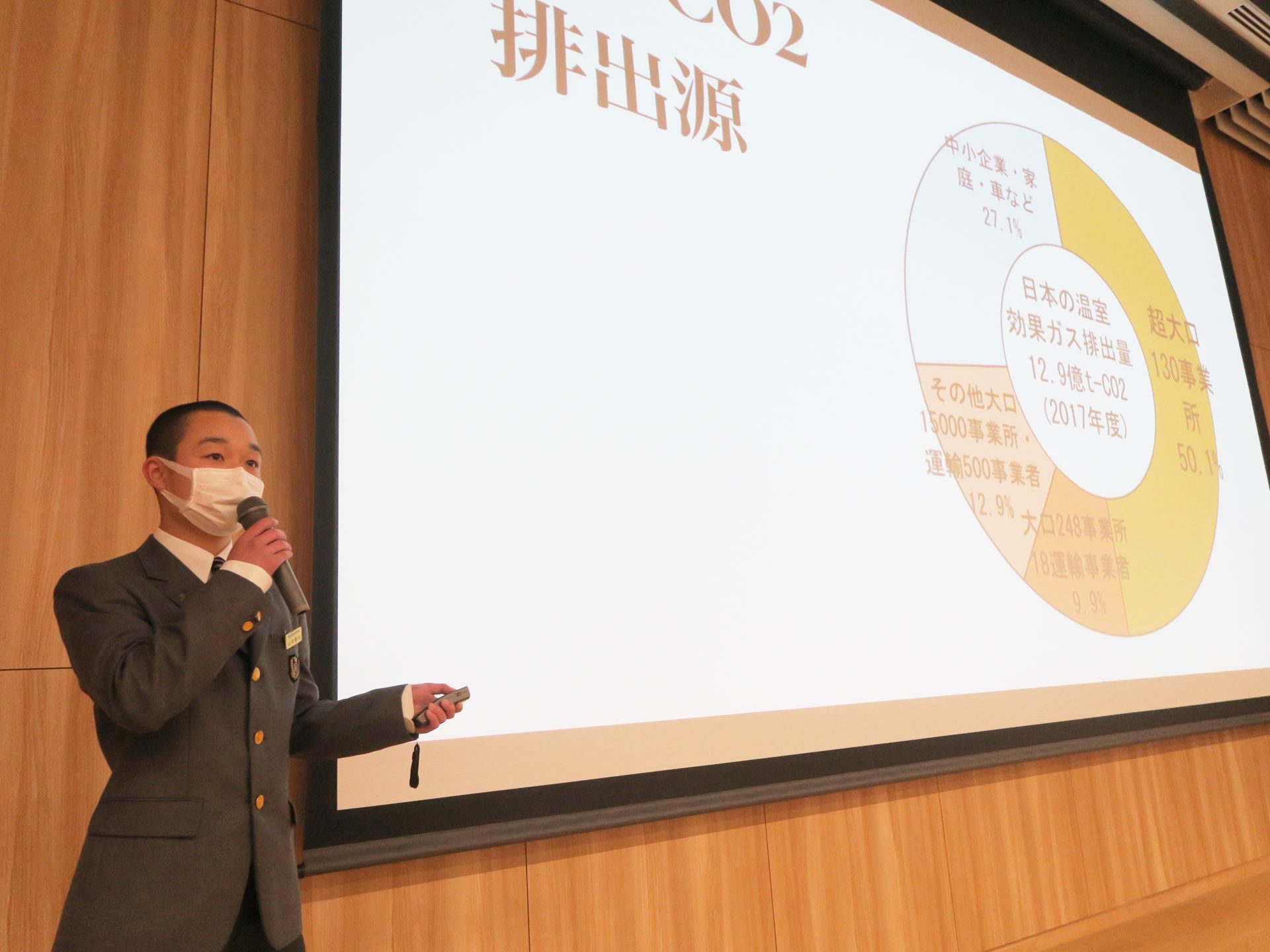 4組目の櫻井君と山本君は、日本企業の二酸化炭素削減の取り組みについて発表しました。環境に配慮した火力発電について、先進的な取り組み事例をわかりやすく紹介しました。
