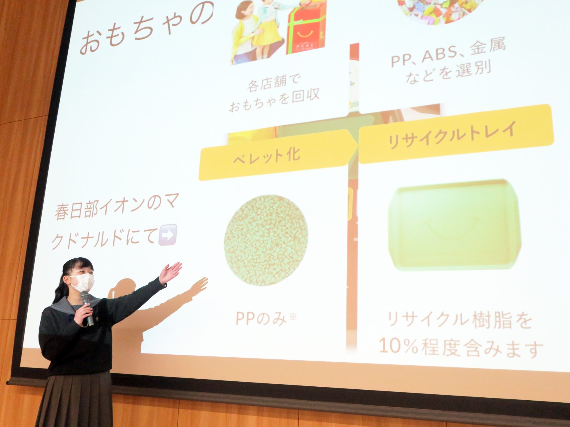 5組目の土方さんと春原さんは、マクドナルドが展開するおもちゃのリサイクルについて発表しました。スライドに動画を挟むなど随所に工夫がみられました。